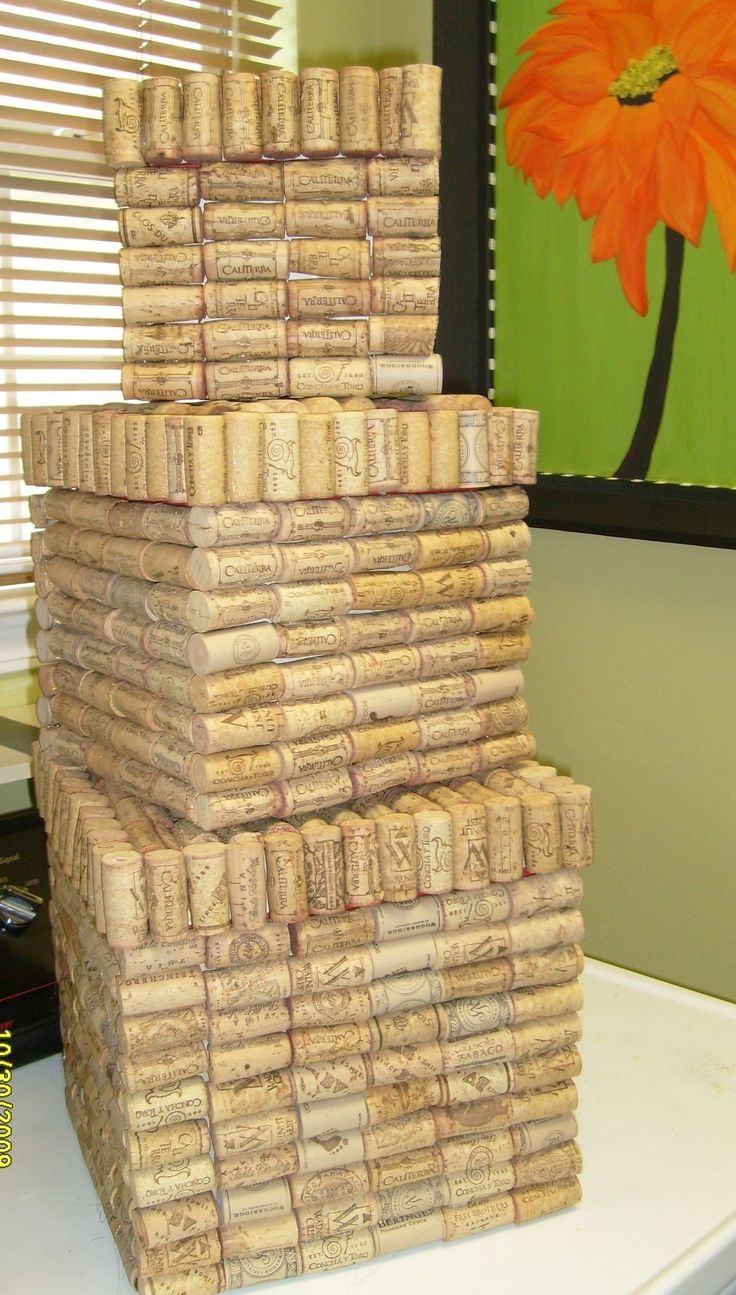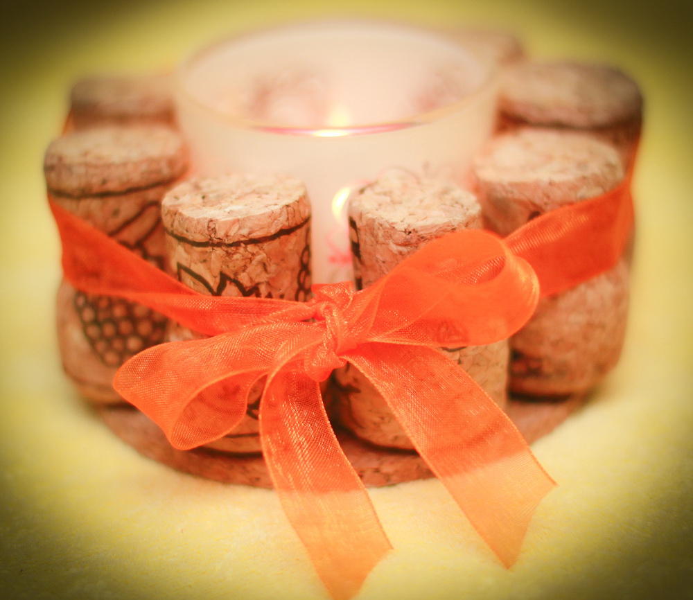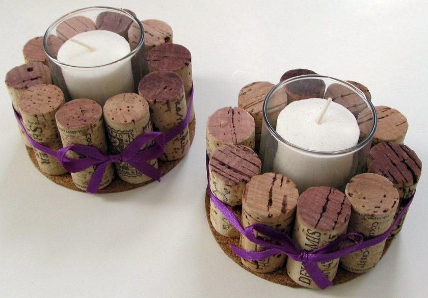 Várias dúzias de rolhas de vinho em combinação com cola e papel acetinado criarão porta-copos exclusivos para pratos quentes. Este é um atributo indispensável para cada cozinha. Corte todos os plugues ao meio para criar uma forma cilíndrica. Cole-os juntos na forma de um círculo ou hexágono.A borda externa é completamente colada com um pano ou fita decorativa. Você também pode colar um pequeno loop.
