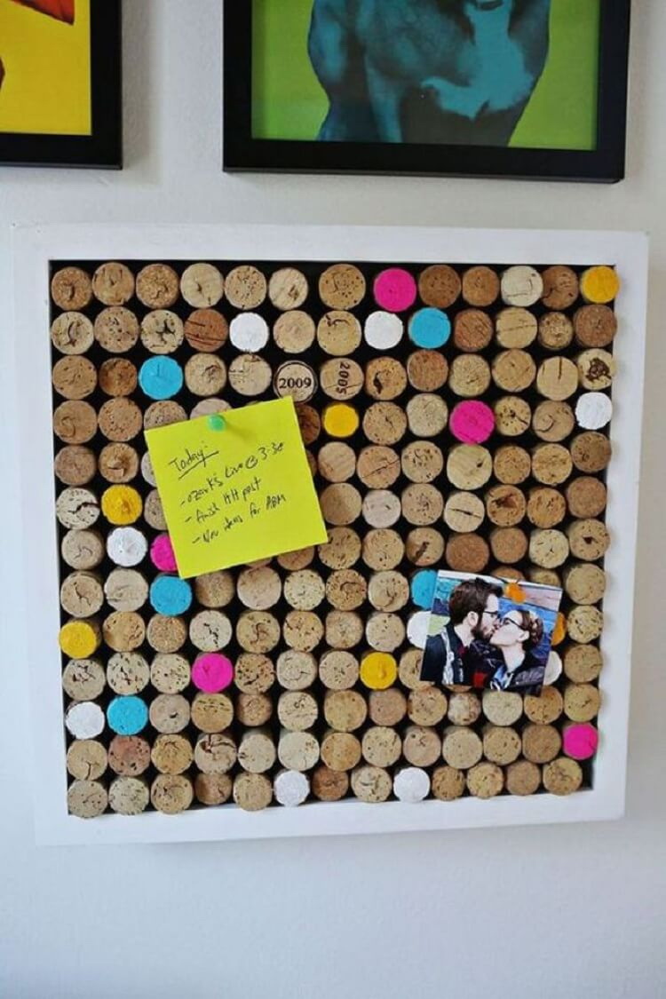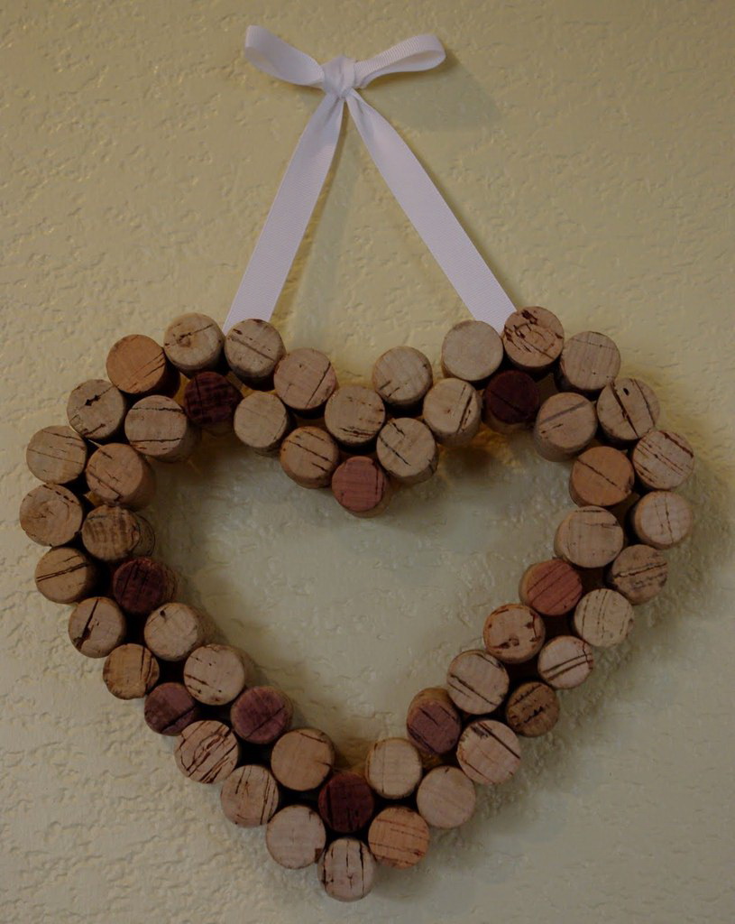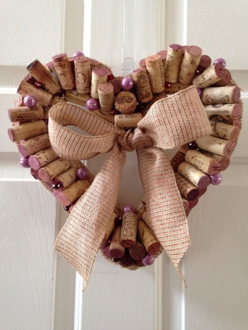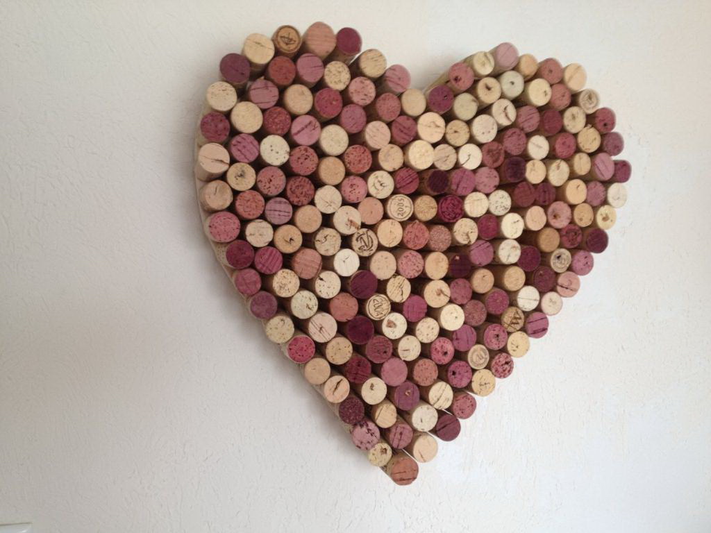 Graças à textura, você pode obter uma imagem 3D incomum. Será difícil fazer uma carta ou uma palavra inteira sem habilidade adequada, mas todos poderão construir um coração tridimensional. Tudo que você precisa é super cola e um pouco de tempo. A imagem resultante será um excelente complemento para o interior de sua casa. Outra aplicação interessante é um fundo elegante para uma sessão de fotos. É fácil pintar a parte da frente das rolhas na sua cor favorita ou fazer uma transição suave, do topo branco ao fundo de framboesa.