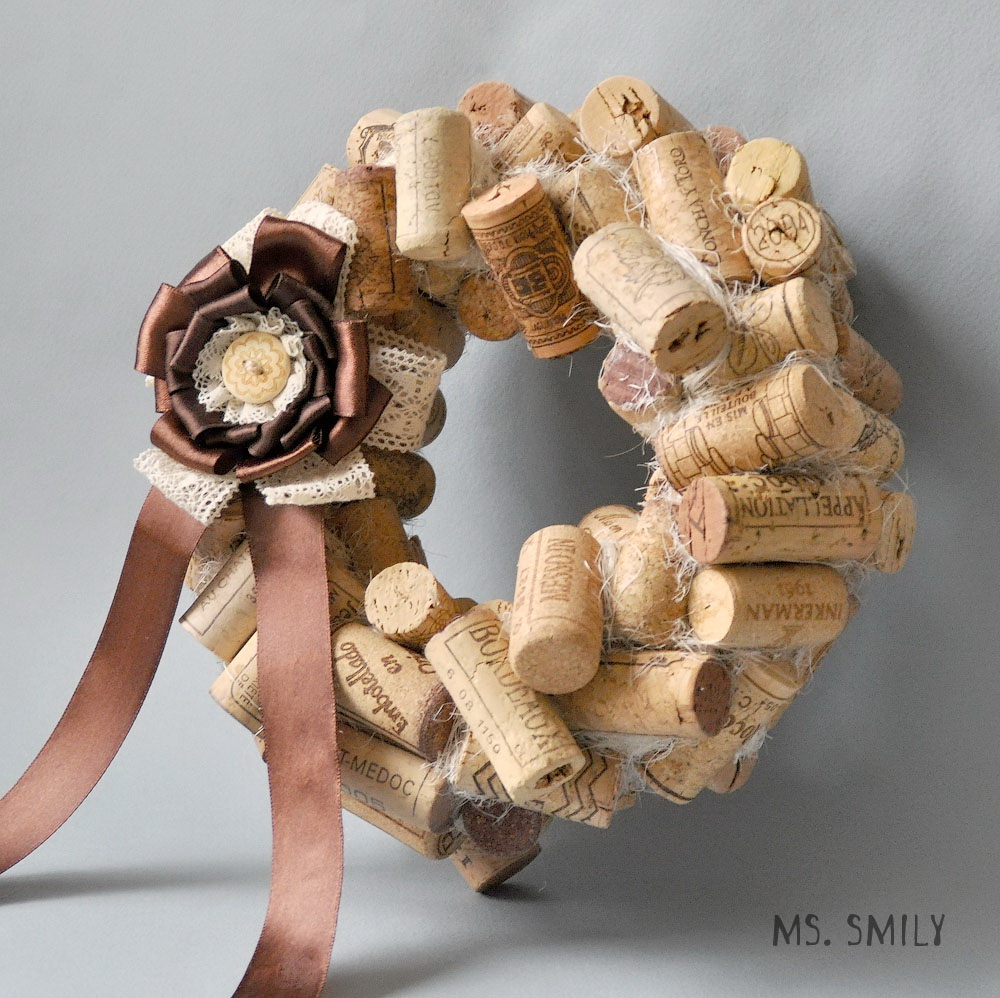 Prepare a cola, a base para a grinalda, os vinhos, o arame, as decorações. Anexar à base da corda ou fita, que irá pendurar uma coroa de flores. Cole a superfície da base com rolhas, deixe o produto secar. Em seguida, prossiga para a segunda camada - deve ser de forma caótica para colar o produto na primeira camada. Então você pode colar os galhos ou fitas.