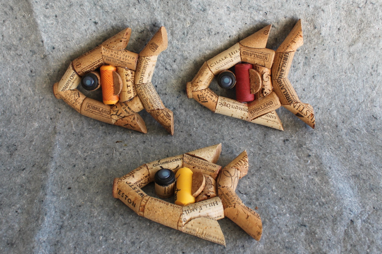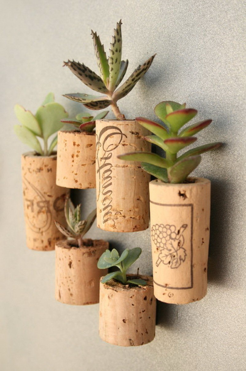 Quem não gosta de decorar sua geladeira com magníficos ímãs que “guardam” notas, fotoscartões postais. Corte a rolha de vinho ao meio (faça um corte ao longo do comprimento. Cole um pedaço de fita magnética e pendure-o a geladeira. Você pode pré-pintar ou decorar um ímã caseiro. Se você cortá-los em círculos, você pode fazer ímãs interessantes para crianças na forma de letras do alfabeto.