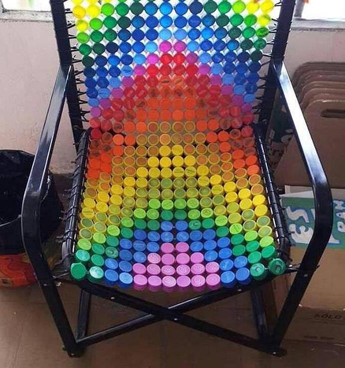 Cadeira de jardim. Se as tampas das garrafas plásticas estiverem presas junto com uma densa linha de pesca, você terá um produto bastante durável e colorido. Como base, use o quadro que resta da cadeira flacidez ou danificada.
