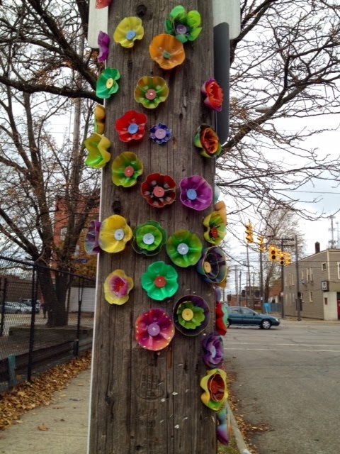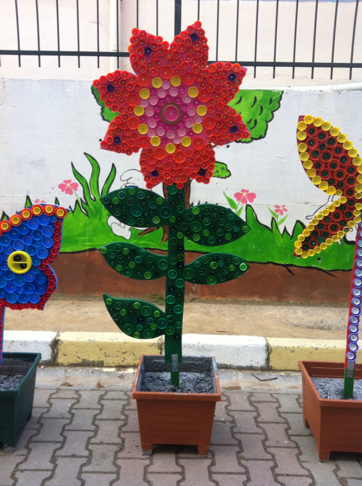Flores decorativas. Eles certamente se tornarão o destaque do seu jardim por causa da aparência brilhante incomum. Prepare sete bonés. Seis deles pintam com tinta acrílica colorida, uma tinta branca (do meio). Formar uma inflorescência, selá-los juntamente com cola à prova d'água. Cole a camomila no bastão de metal.
