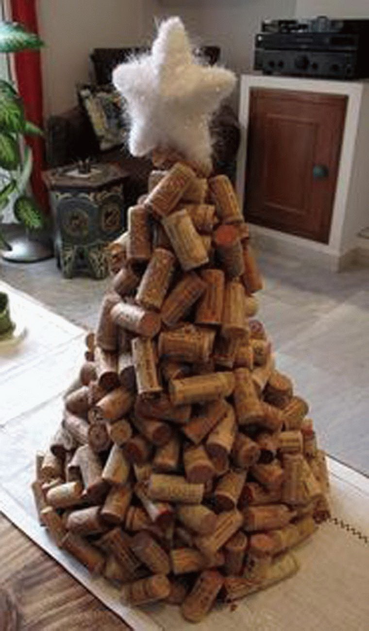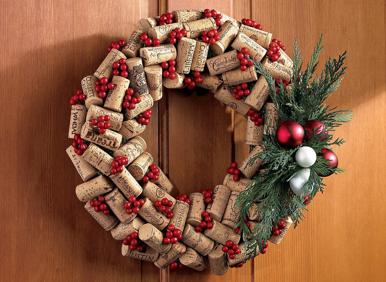 Guirlanda de natal. Se acumulou um grande número de rolhas, pode decidir criar uma coroa de flores. O atributo deste ano novo é frequentemente pendurado na porta da frente. Isso ajuda a criar uma atmosfera festiva, trazer conforto e solenidade.