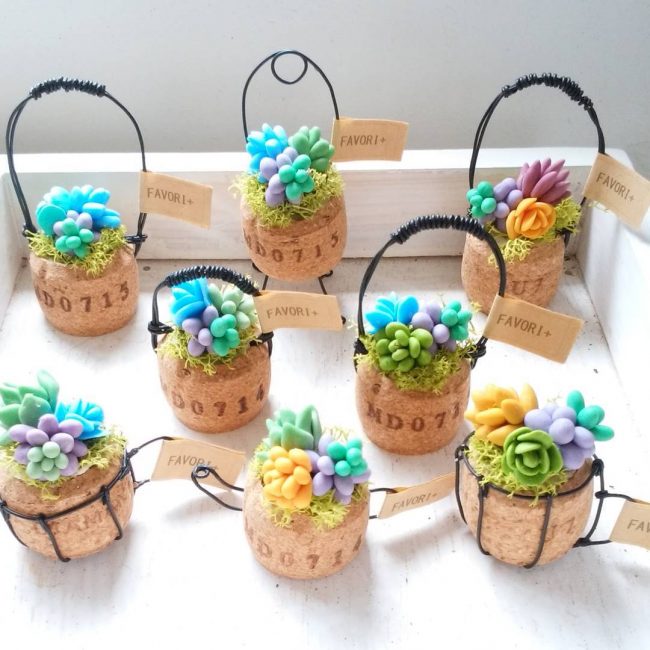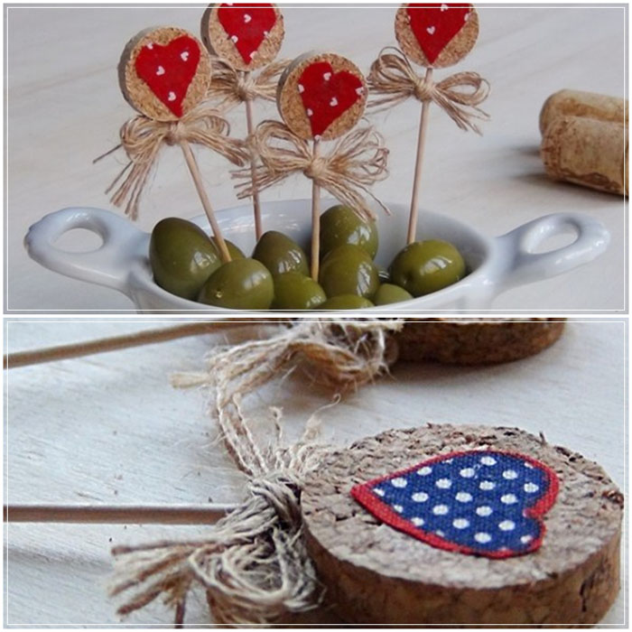 Para a chegada dos convidados a sua mesa parecia original, use este conselho. Cortar em canecas de cortiça, encontrar palitos de dente e barbante, encontrar elementos interessantes para decorar. Use um círculo com um coração de tecido, contas ou arcos de corda presos a cada palito. Os hóspedes perceberão essa engenhosidade!