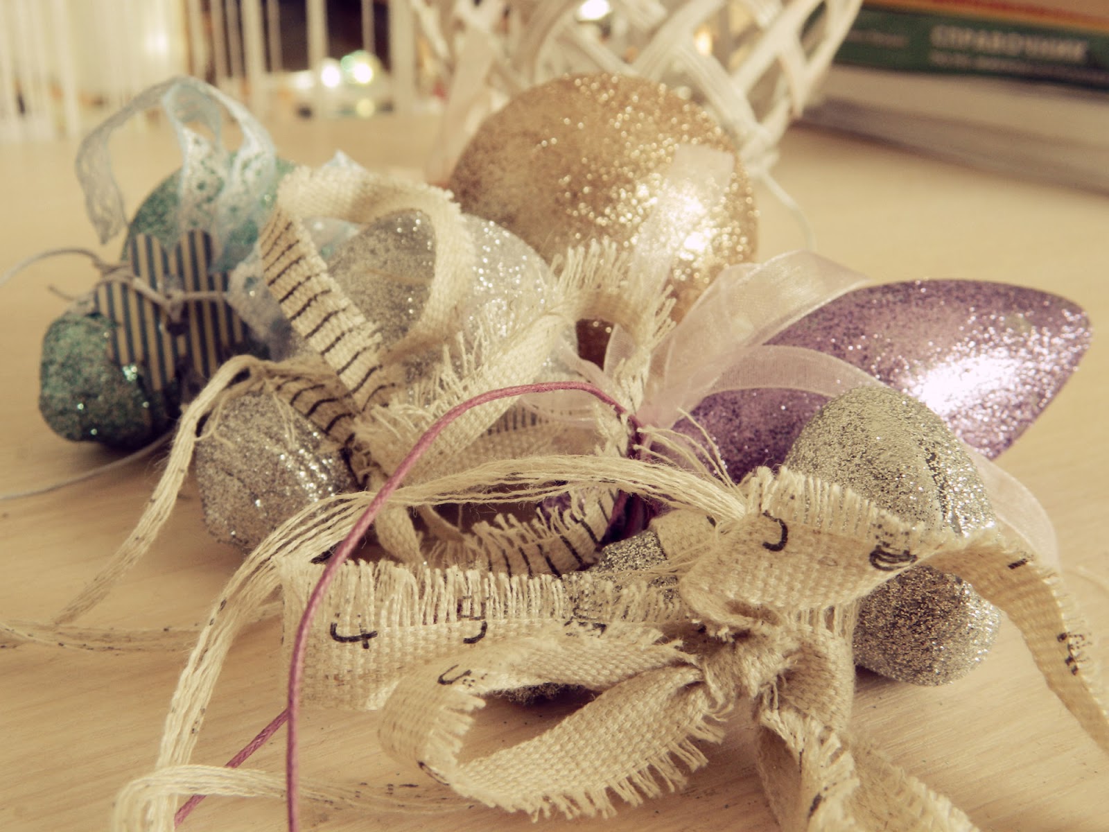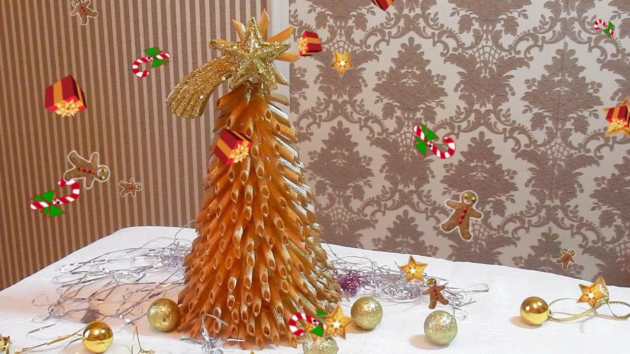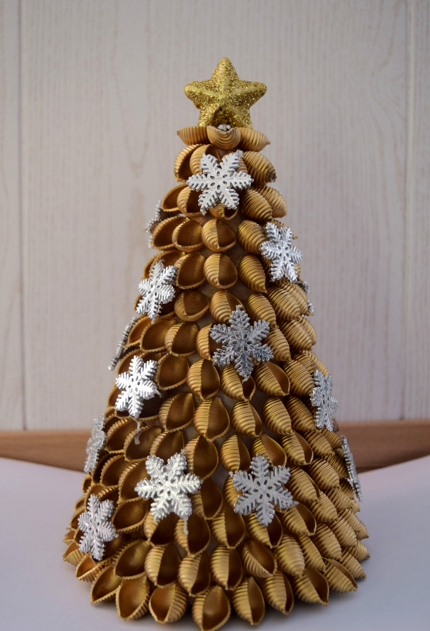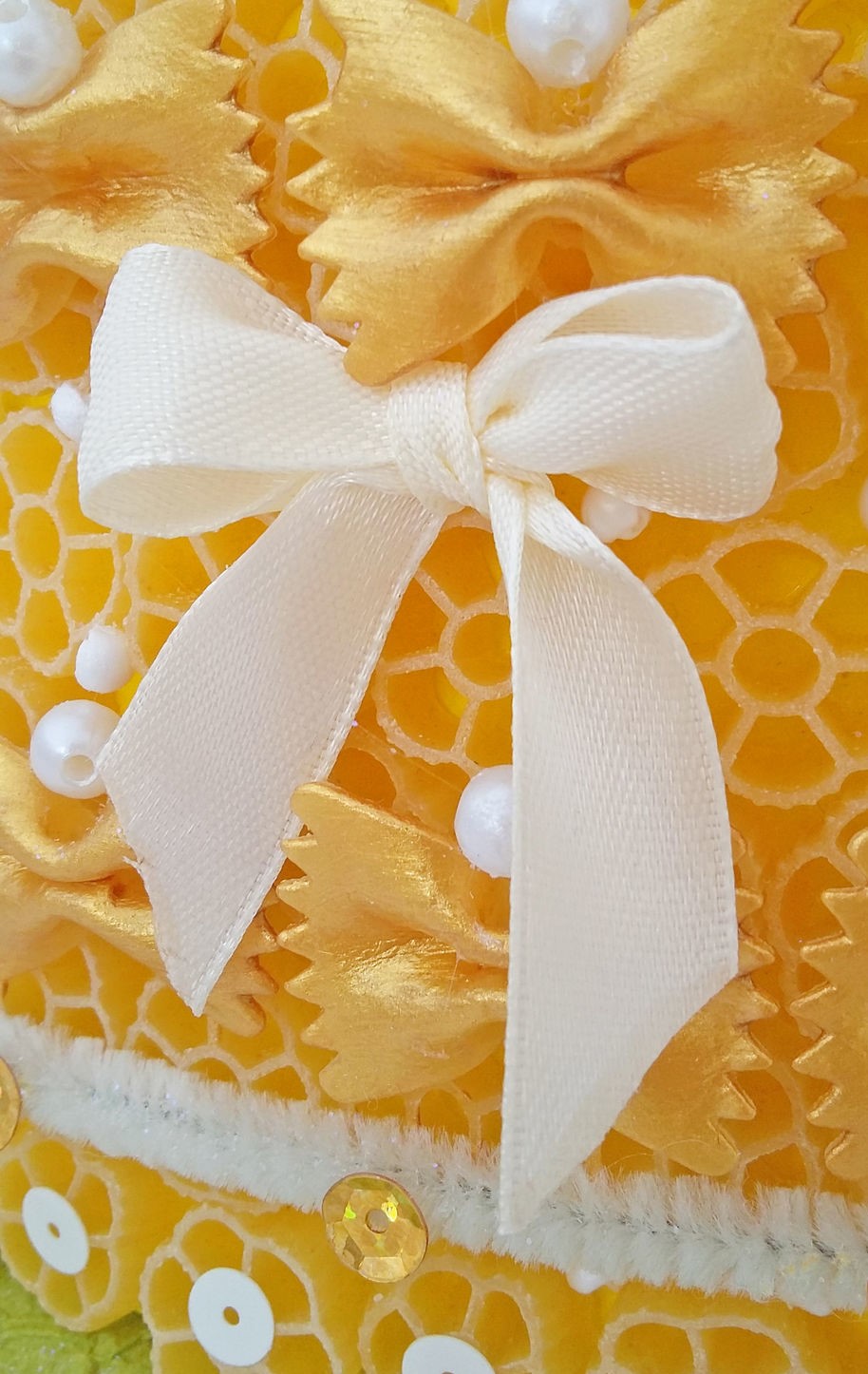 Para que tal artigo pareça festivo, você pode decorá-lo, por exemplo, com o enfeite da chuva. Se você tiver macarrão de uma forma diferente, eles também podem ser usados pintando-o em uma cor diferente, preferencialmente ouro ou prata.