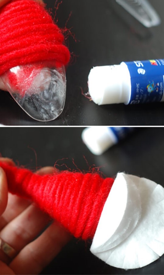 Em seguida, instale a árvore de Natal em um suporte, que pode servir como um pequeno castiçal ou um carretel de linha, de preferência em preto ou marrom.