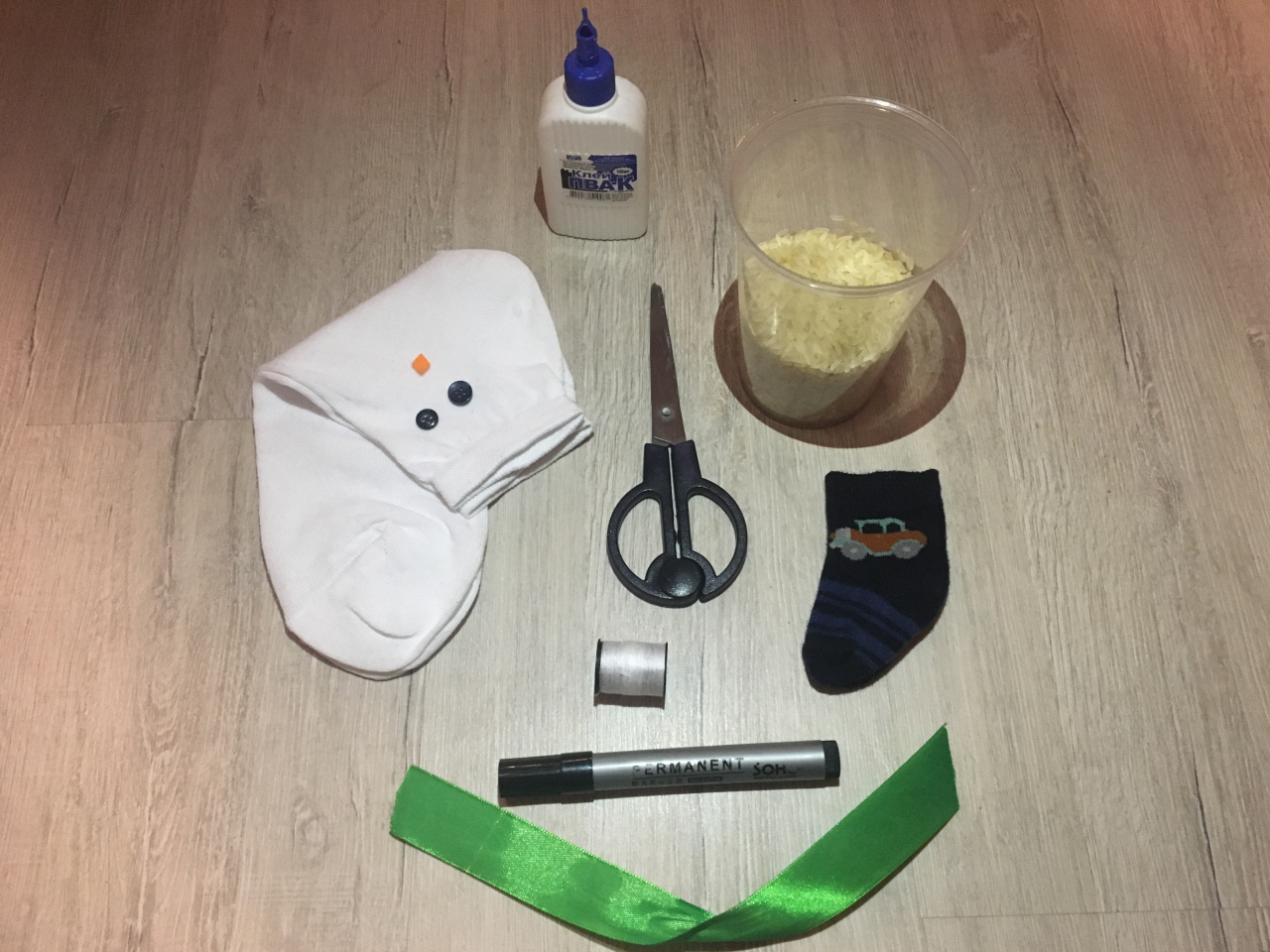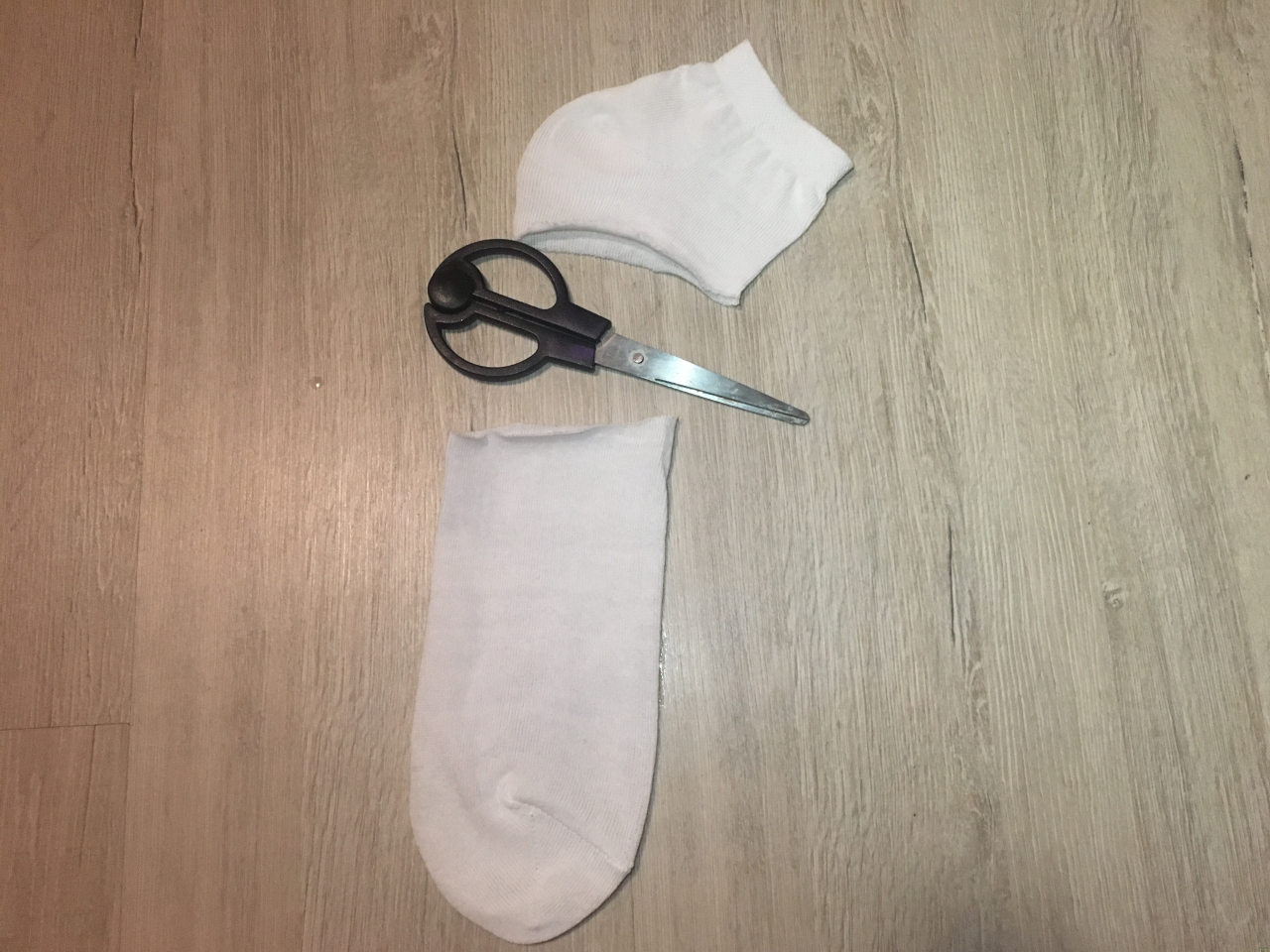 Para começar, preparamos uma meia: cortamos em duas partes para que uma delas tenha um top, um salto e alguns centímetros do pé. É importante que a meia esteja limpa, branca como a neve, porque se você pegar a velha, bem usada, o boneco de neve se mostrará apropriado. Nós prendemos o final da meia ao longo da qual a linha de corte passa, separando uma pequena quantidade de tecido de cima.