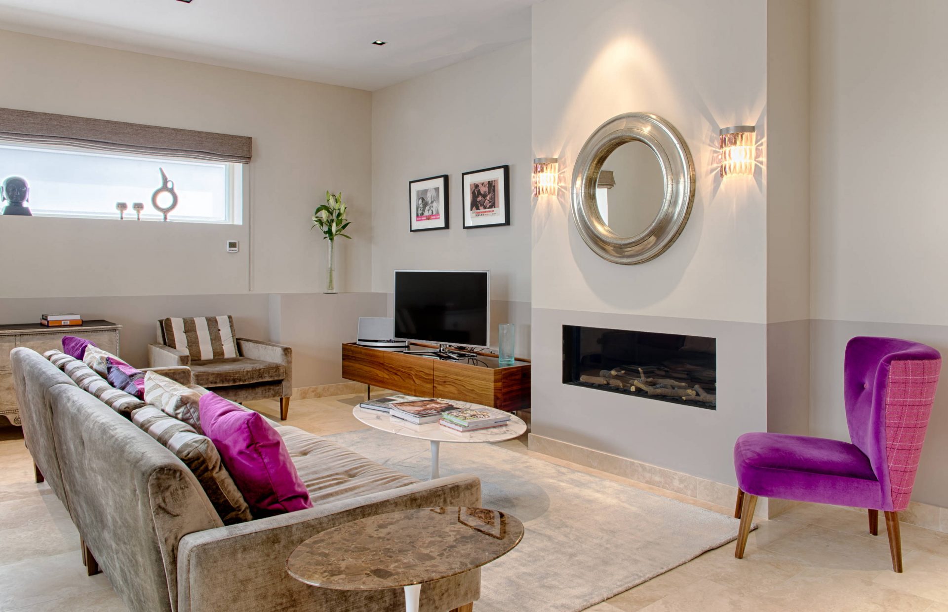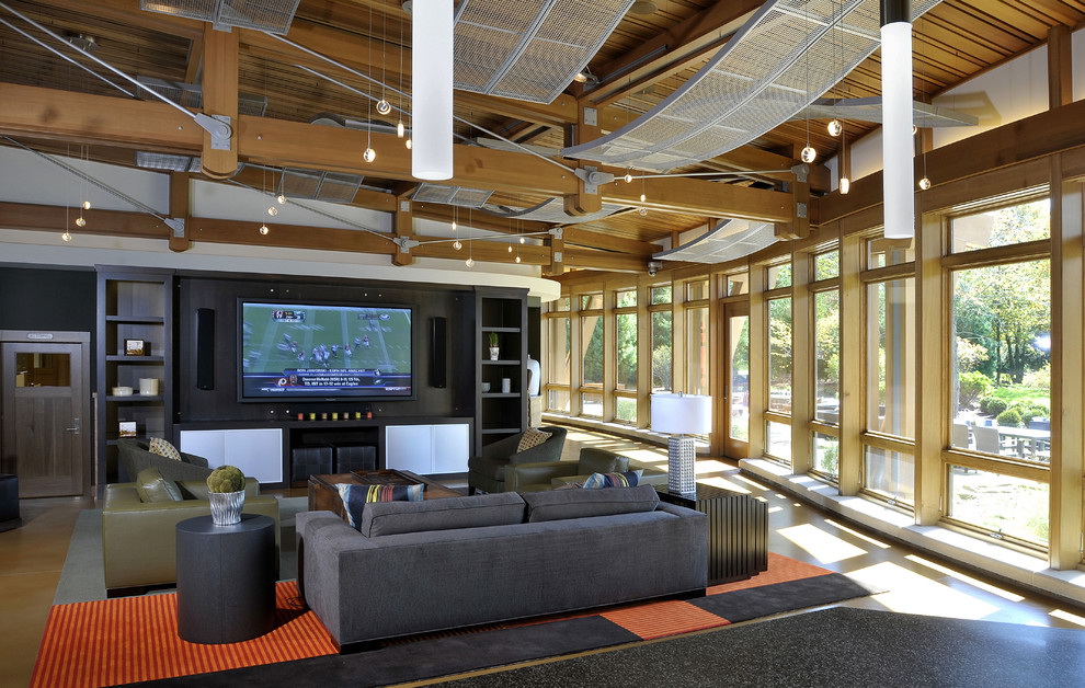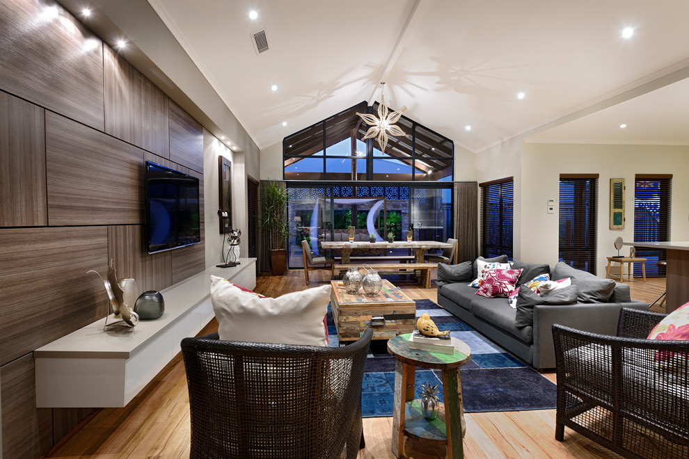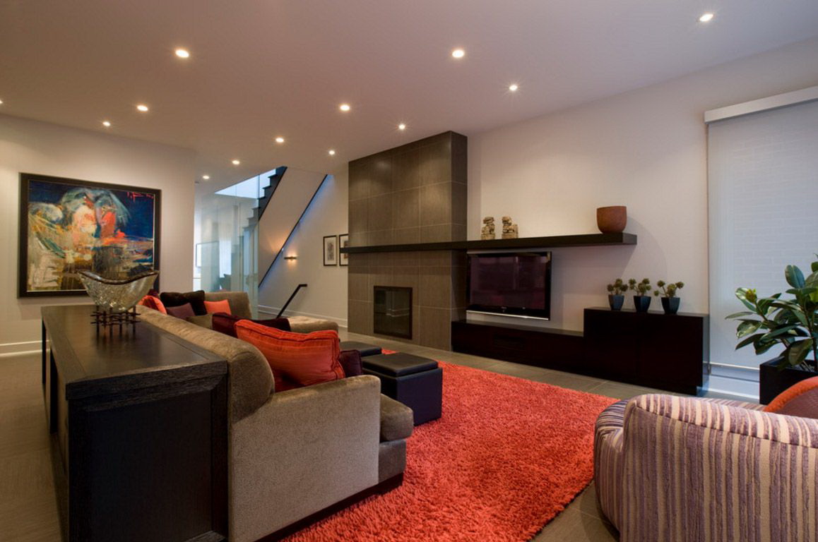 - Luz do ponto. Rodada pequena luminárias definido em tecto, a alguma distância da TV. Quando ligado, quando o resto do mundo está desligado, eles destacam a "área de cinema", eles permitem que você salve seus olhos de estresse desnecessário. Se desejar, você pode ajustar a intensidade de sua luz. Ou segure um interruptor separado para cada pequena lâmpada.