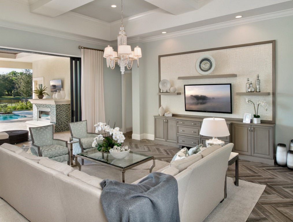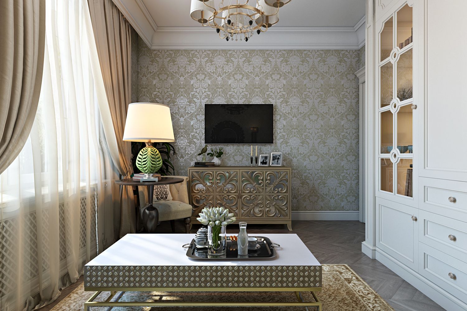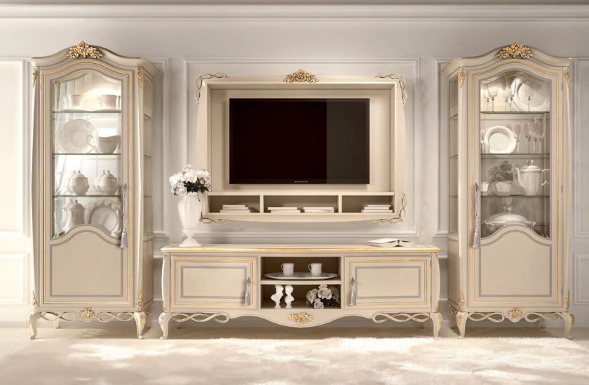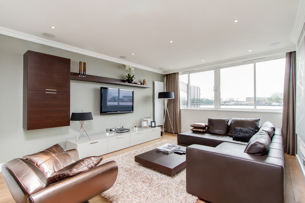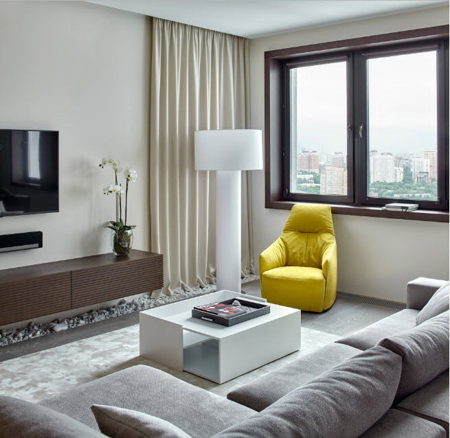 - Sala de estar. Aqui a TV muitas vezes se torna o centro do interior - fica em uma prateleira na parede, em frente a ela sofá. Toda a família se reúne aqui para assistir a um show interessante, os convidados sentam na frente dele assistindo o filme. Portanto, ele mesmo deve ser grande, e o regimento deve ser largo, grosso, de preferência em suportes. Aqui, prazeres estéticos são bem-vindos, especialmente se o estilo do cenário os aceita.