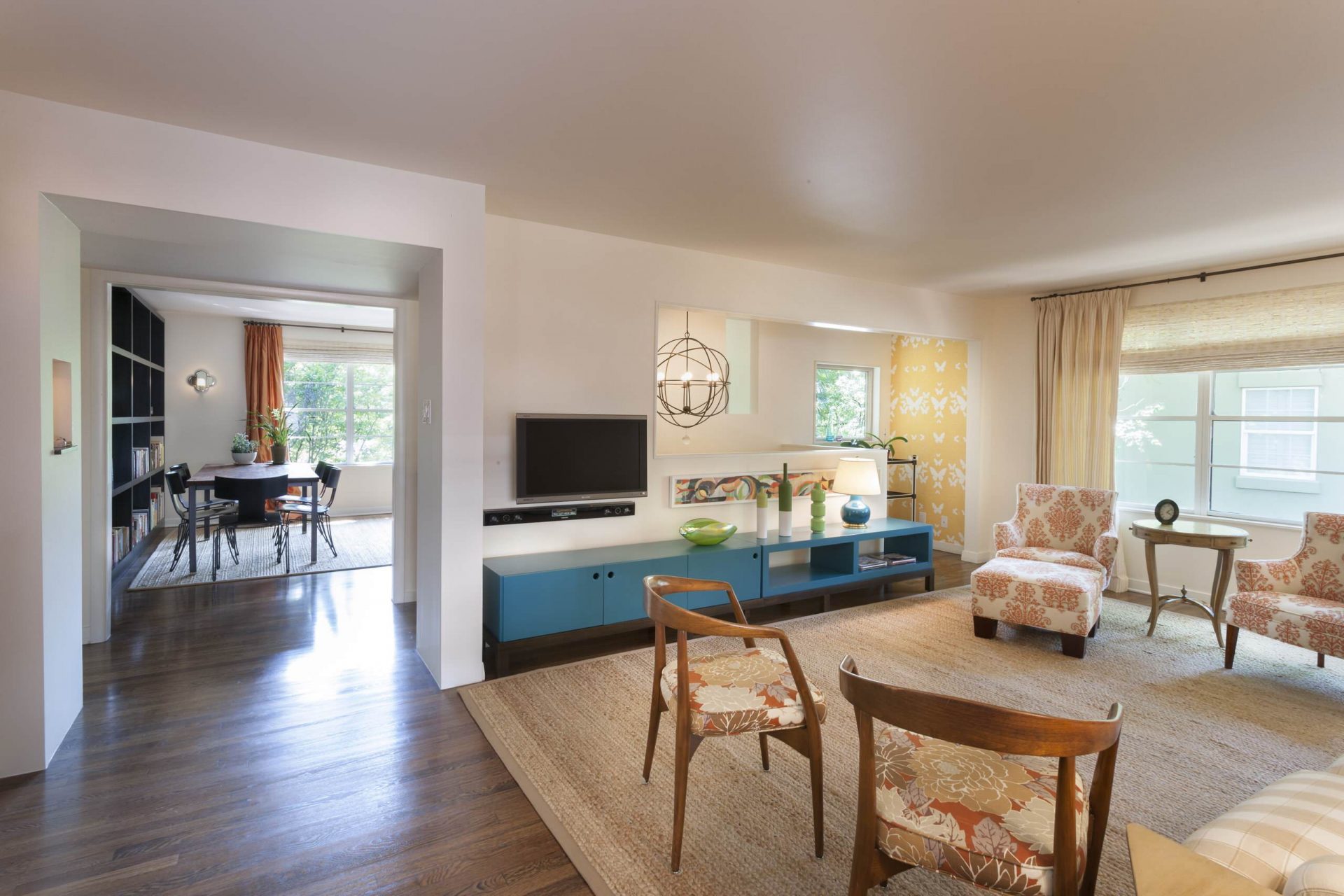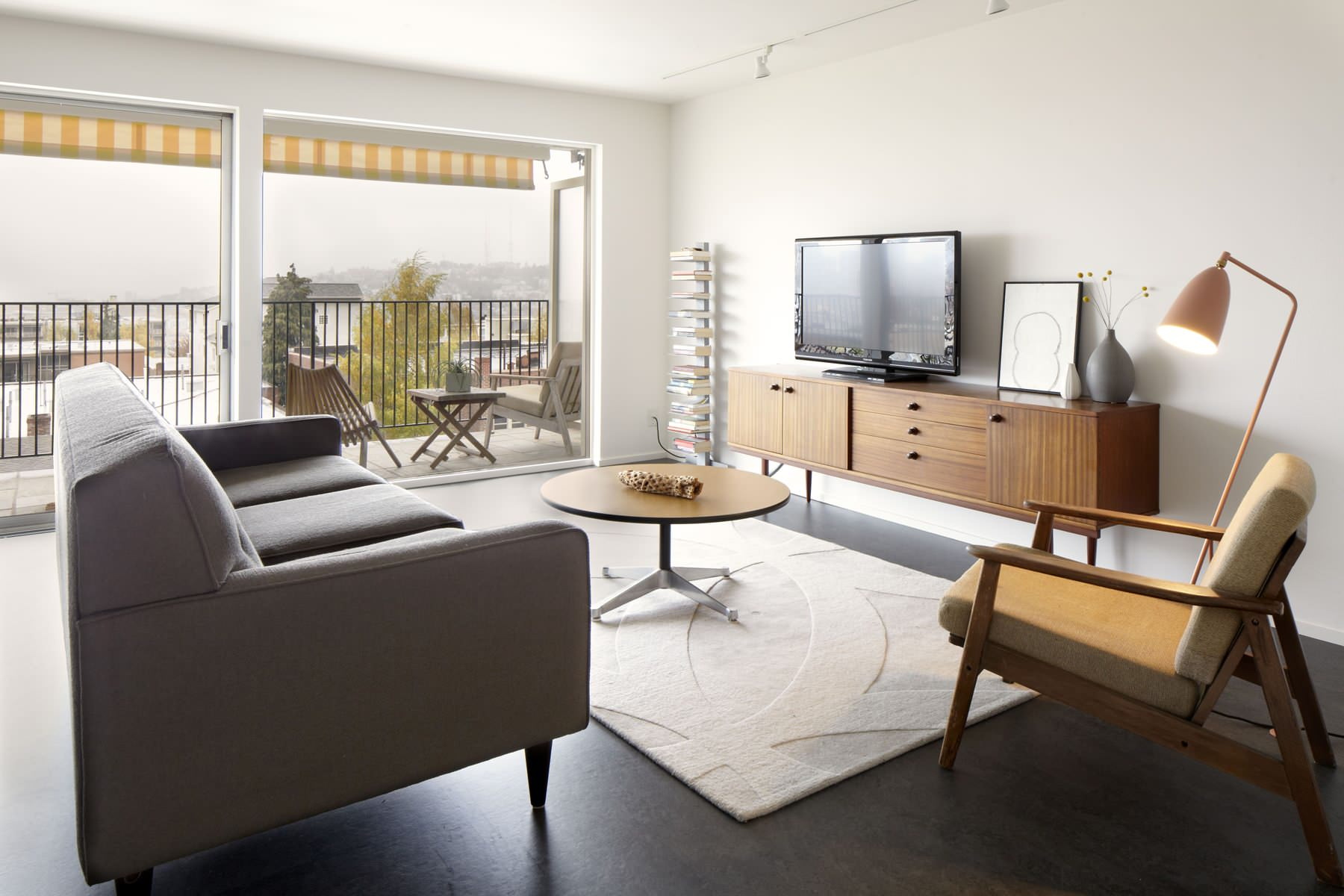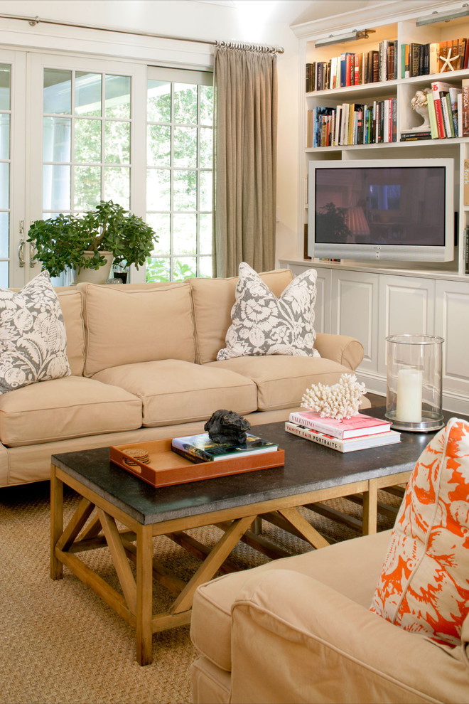 - Sala de estar. Aqui a TV muitas vezes se torna o centro do interior - fica em uma prateleira na parede, em frente a ela sofá. Toda a família se reúne aqui para assistir a um show interessante, os convidados sentam na frente dele assistindo o filme. Portanto, ele mesmo deve ser grande, e o regimento deve ser largo, grosso, de preferência em suportes. Aqui, prazeres estéticos são bem-vindos, especialmente se o estilo do cenário os aceita.