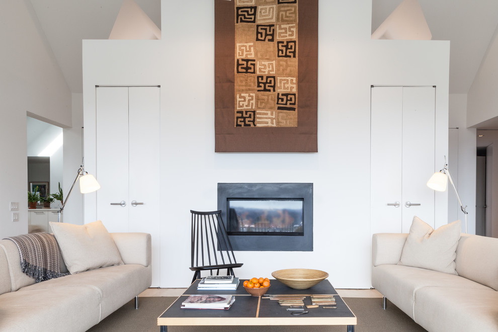 - Quadro. Parece armário sem portas, que é TV embutida. Formas em torno dele algo como um nicho, permite distingui-lo estilisticamente no interior.