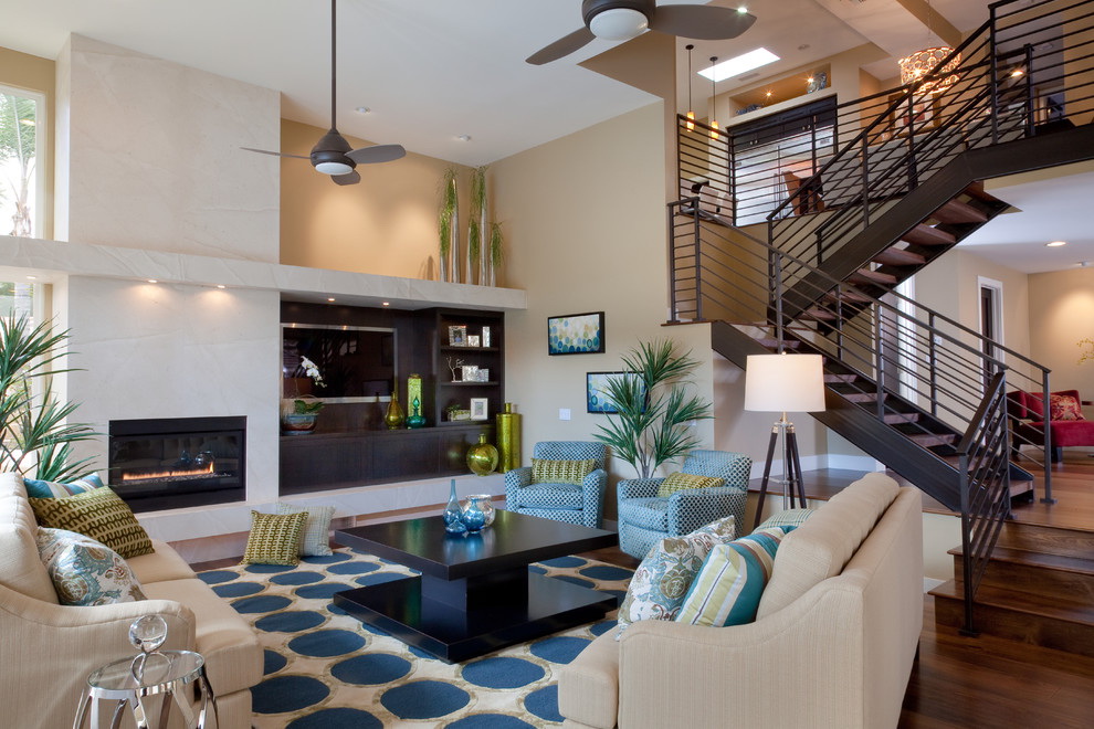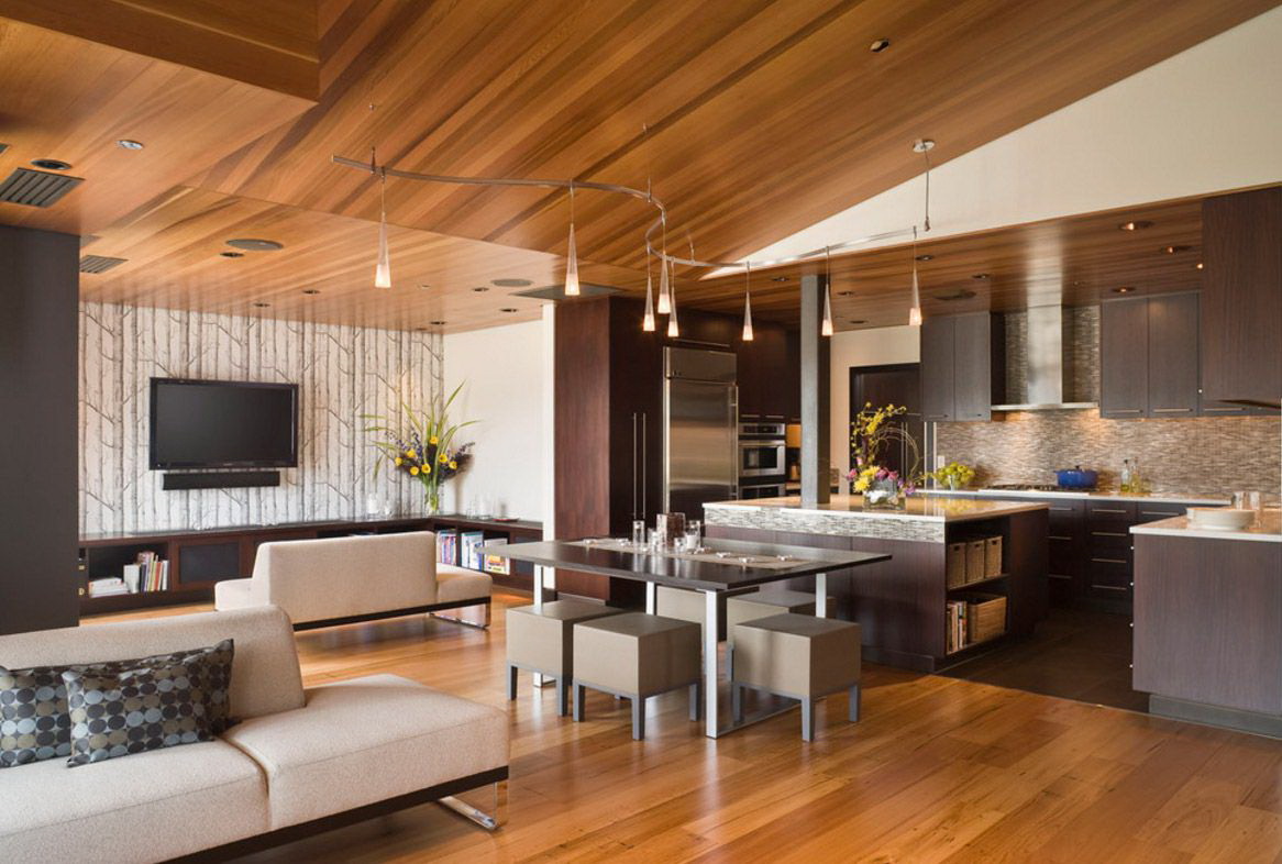 - Adição de decoração. O design pode ser multi-camadas, com paredes, com uma variedade de decorações, iluminação e complementar o estilo geral da sala.