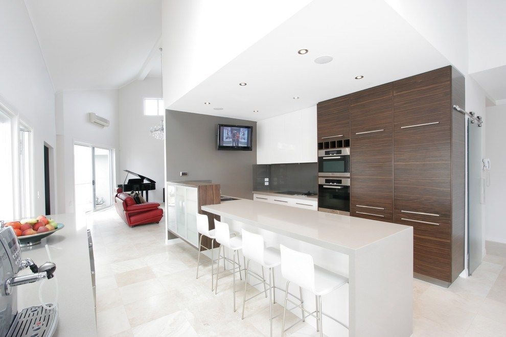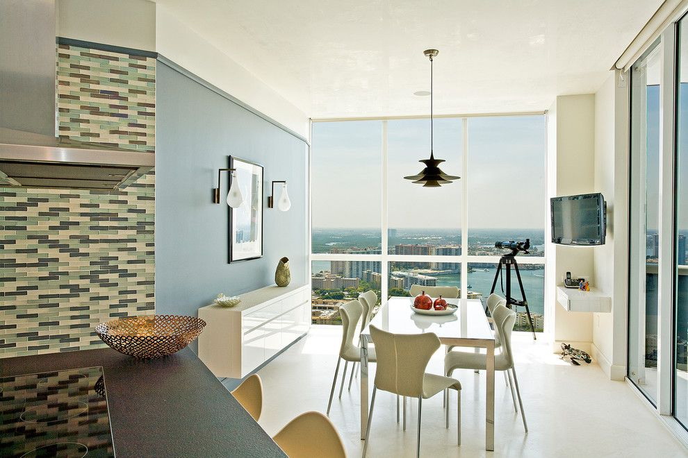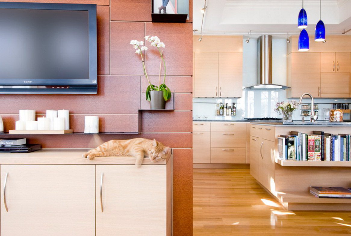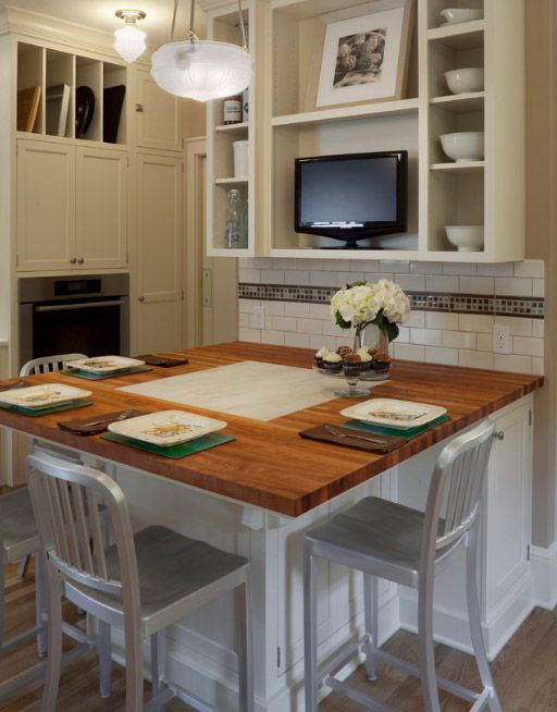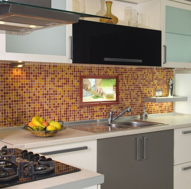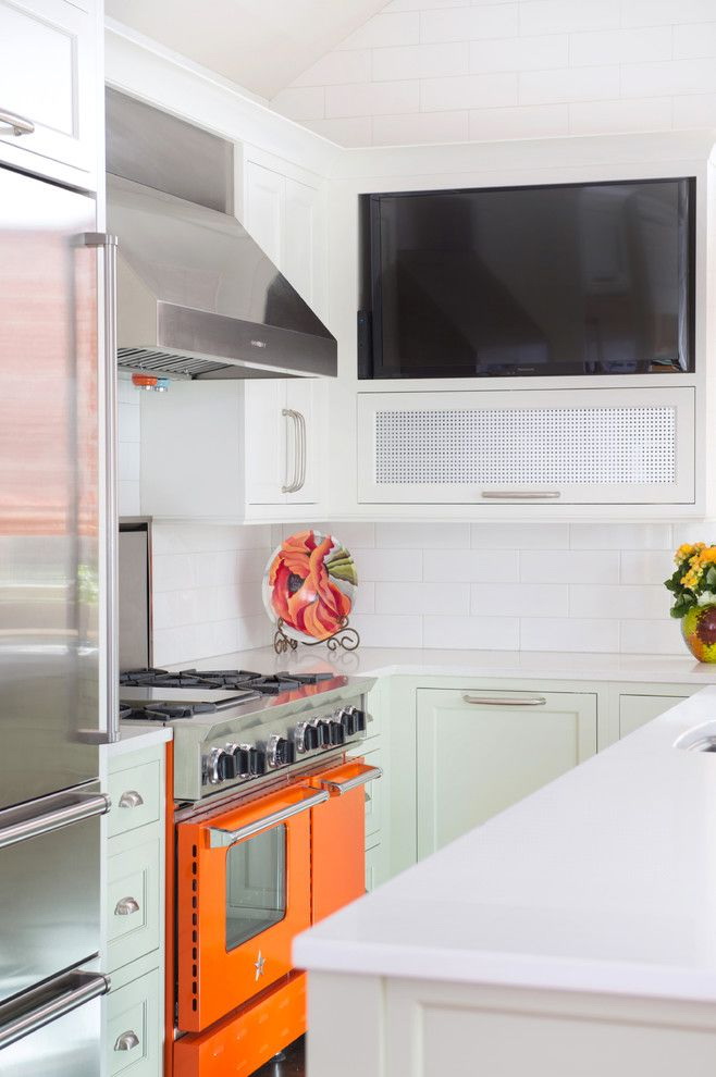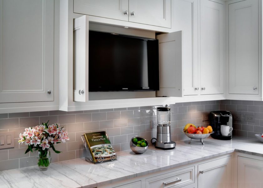 A exceção é a TV na cozinha, que não é muito assistir, mas ouvir. Mas se sua cozinha serve como sala de estar e durante a refeição você gosta de assistir às notícias, é melhor colocá-la abaixo, no nível dos olhos.
