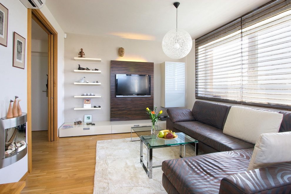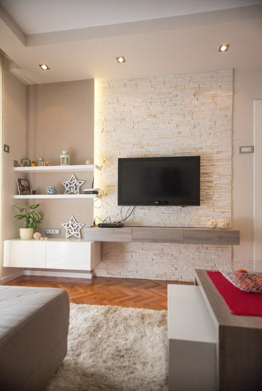 Quanto ao resto, é possível colocar a TV e a prateleira sob ela a seu próprio gosto - no canto, no centro da composição, em um grande nicho, na parede final ...