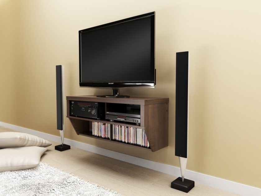 - Colocação de acessórios. Se houver poucas superfícies de armazenamento horizontais na sala, uma prateleira sob a TV pode aumentar seu número. Além disso, pode acomodar acessórios relacionados à própria TV - um reprodutor de DVD, por exemplo, ou uma coleção de discos.