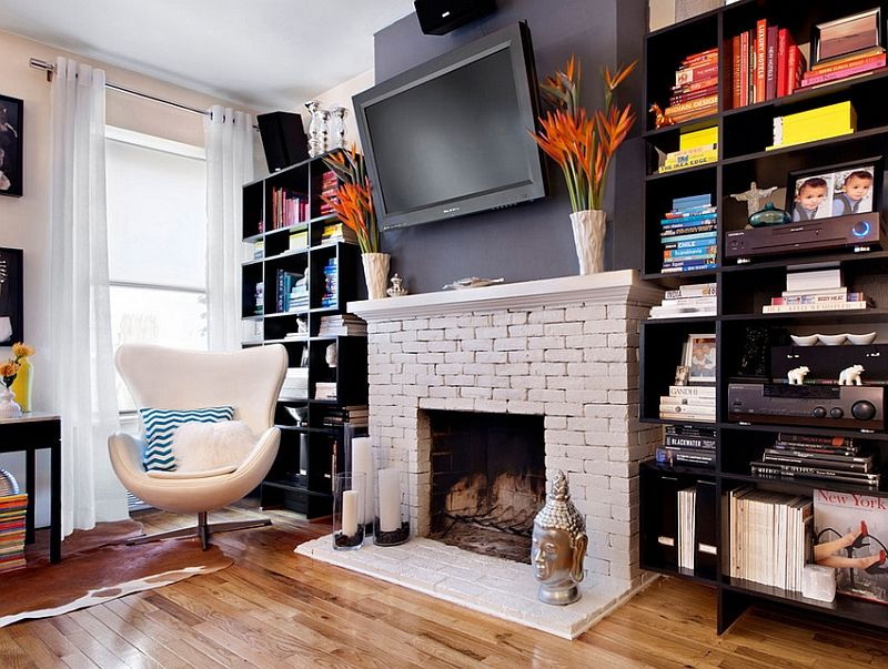 Além das opções mais comuns, em torno da TV pode ser colocado, de fato, qualquer coisa - livros, figuras colecionáveis de heróis de quadrinhos, uma árvore de contas, dobradas na técnica de origami, uma estrutura complexa.