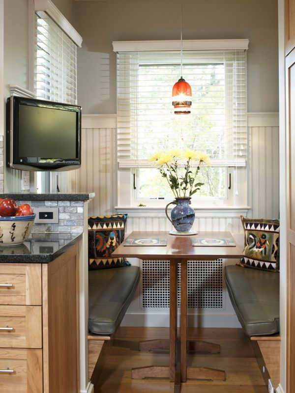 - Cozinha Aqui, a TV geralmente funciona como um pano de fundo, sob o qual o cozinheiro conserta os produtos, apenas ocasionalmente olhando para a tela. Em tais circunstâncias, a TV deve ser pequena e a prateleira - de modo a ocupar o menor espaço possível possível. Seria ideal torná-lo angular, talvez mais alto que o nível dos olhos, para que algo mais pudesse ser colocado sob ele. Delícias estéticas especiais não são necessárias.