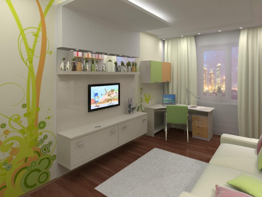 - Infantil. Uma TV separada para uma criança, para que ele pudesse assistir a desenhos animados, não deveria ser muito cara ou pesada - no decorrer do jogo eles podem derrubá-lo, bater nele com um cotovelo ou balançá-lo. Uma média de TV em uma prateleira baixa é a melhor solução. Delícias estéticas - para saborear o bebê.