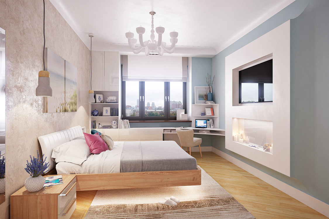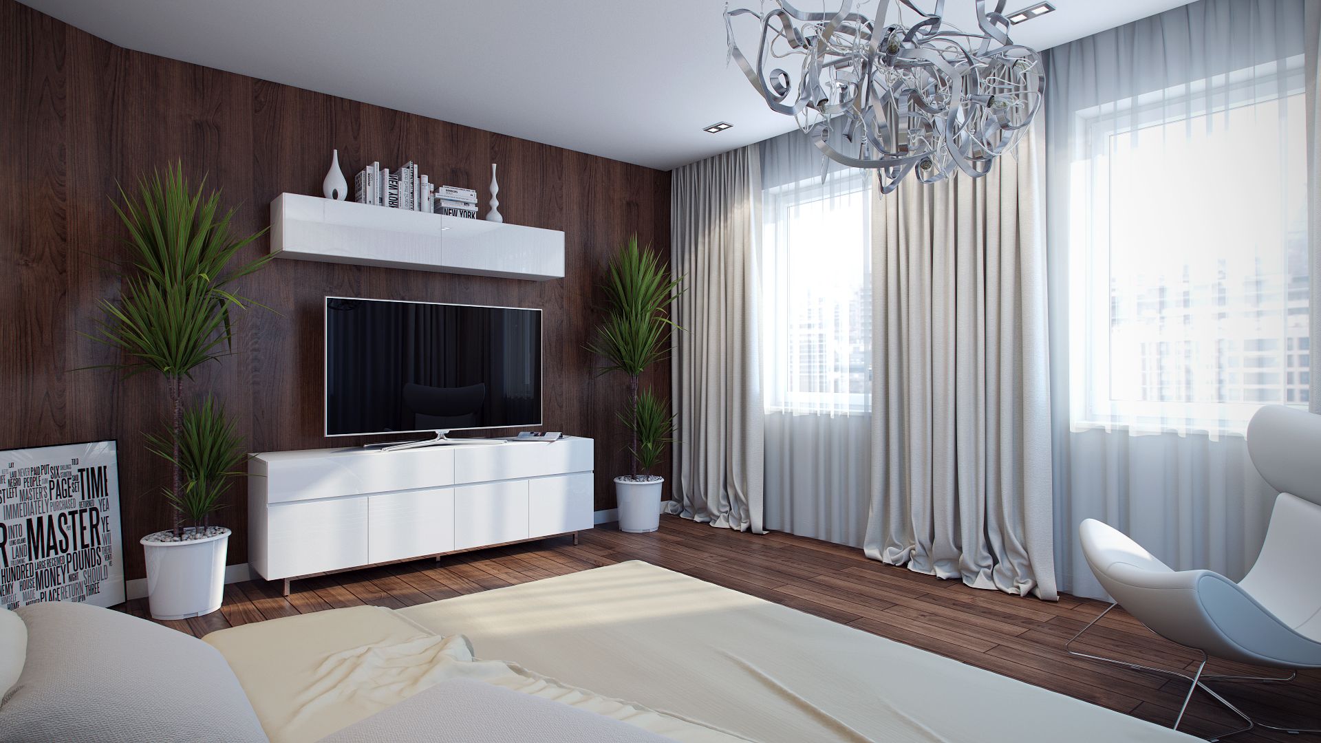 - Um quarto. A TV raramente é instalada aqui, porque as pessoas raramente passam mais tempo no quarto do que precisam dormir diretamente. Portanto, se é decidido colocá-lo, no entanto, não há conselhos gerais. A principal coisa - que ele não saiu.