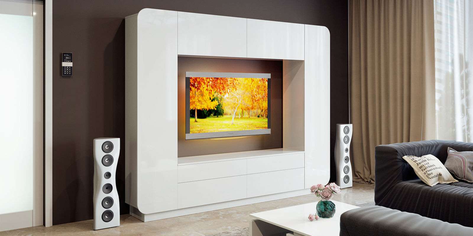Também um grande papel no design da prateleira é a iluminação. É capaz de destacar todo o canto com uma TV.