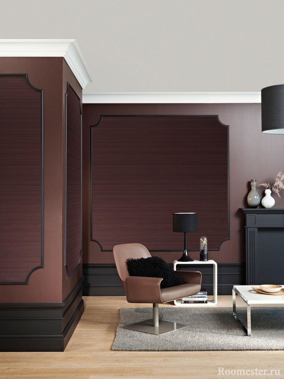 - Fazer uma baguette larga para as paredes torna o teto menor. O mesmo efeito é obtido ao usar um plinto escuro e largo.