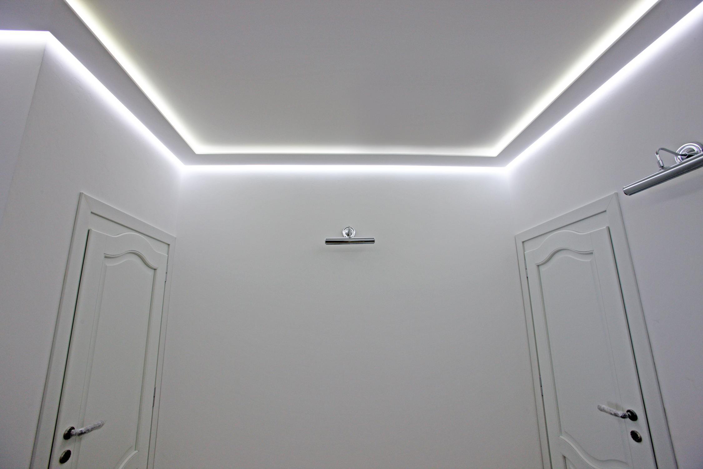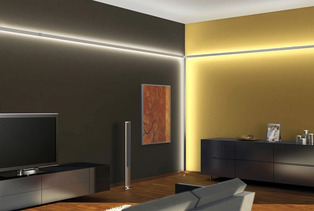 A organização de tal iluminação ocorre devido à colocação da faixa de LED em um slot especial. Dependendo da localização da ranhura (superior, inferior), um efeito diferente pode ser criado: