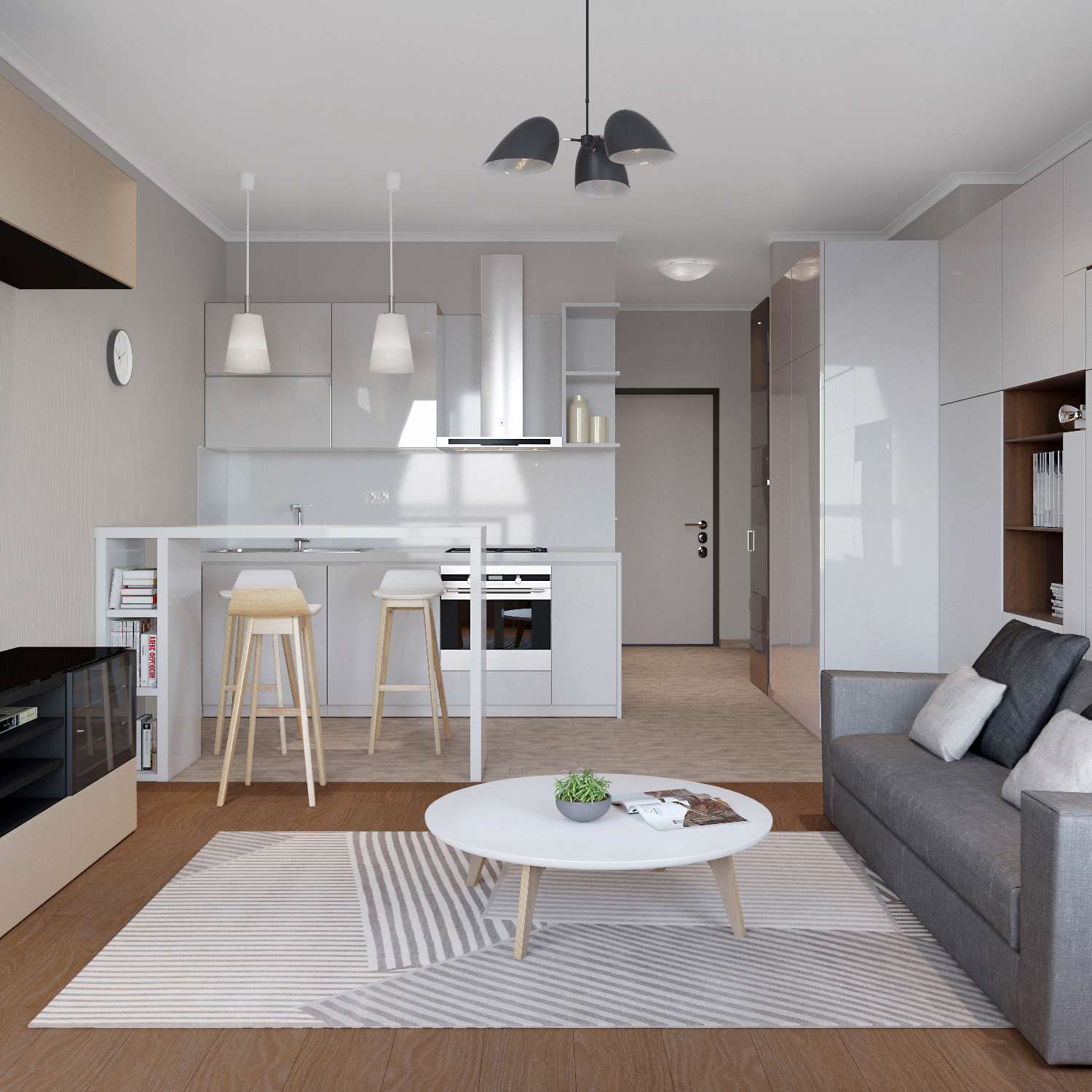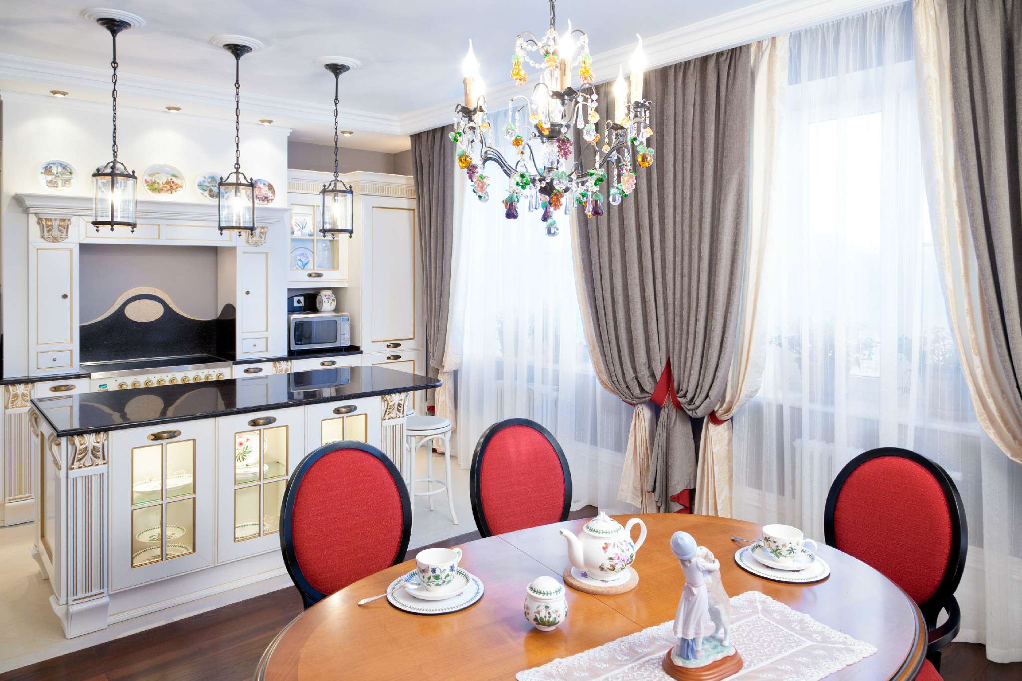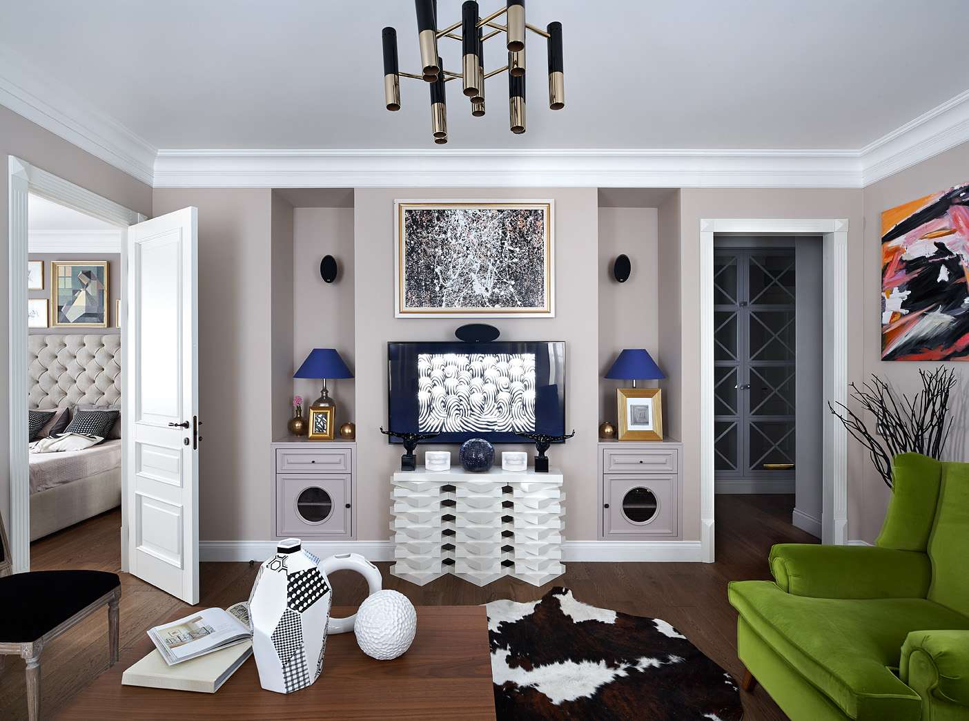 - Branco - universal, além de visualmente expande o espaço. Preto - pelo contrário, mas às vezes pode ser aplicado como um companheiro de sombra.