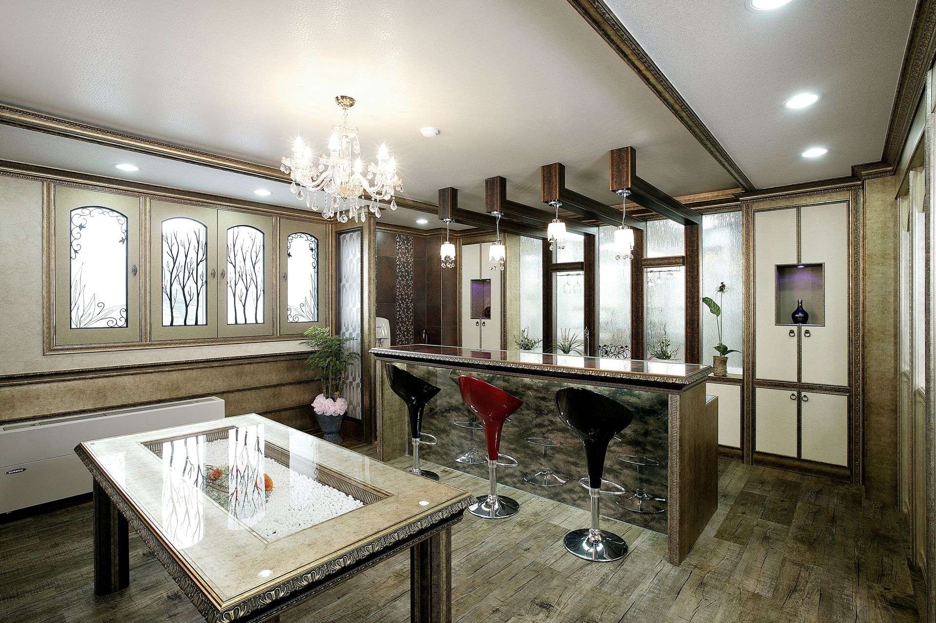 - Se a área da sala for pequena, é melhor escolher um pedestal para combinar com o teto.