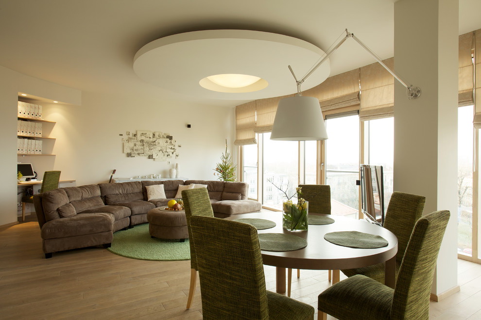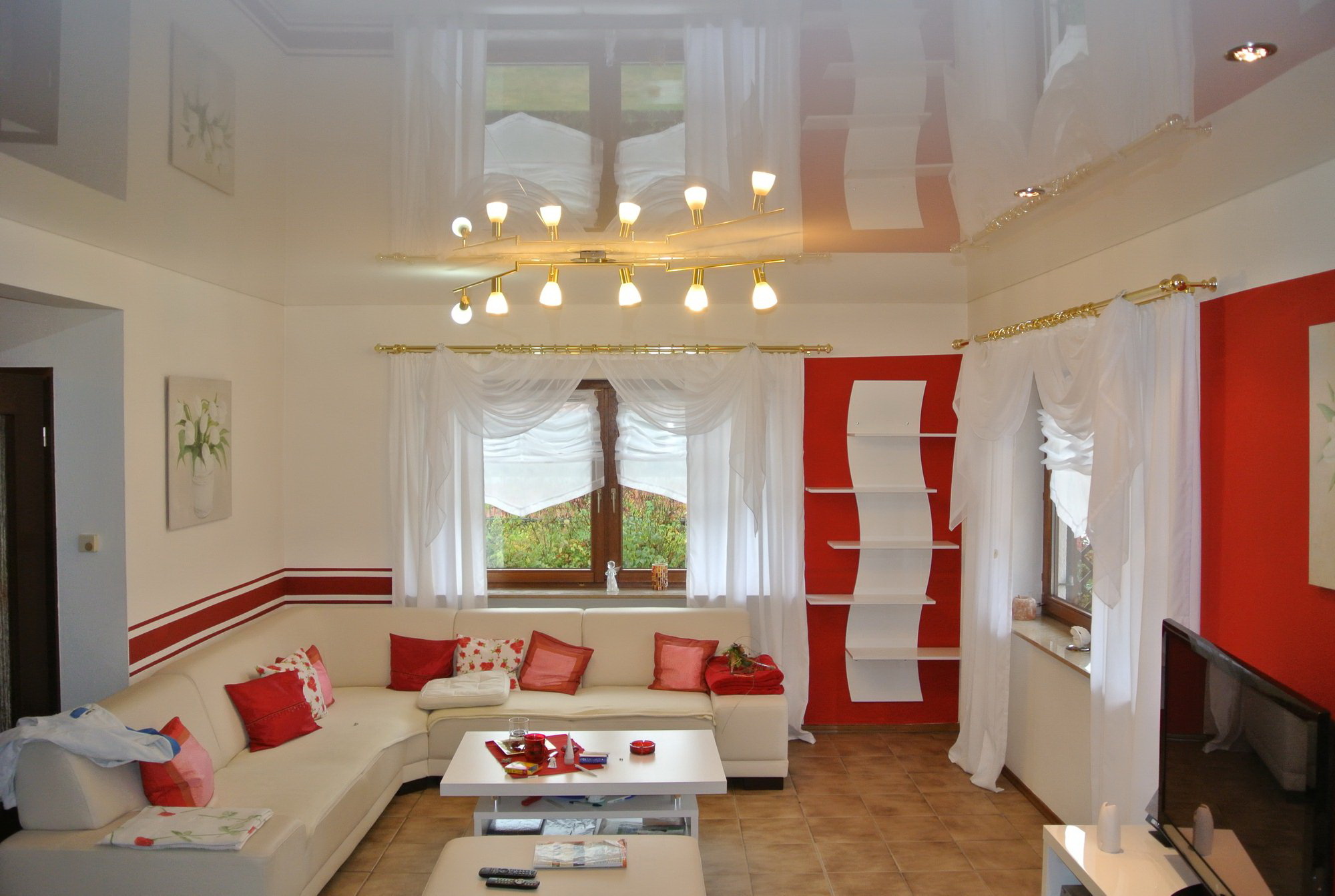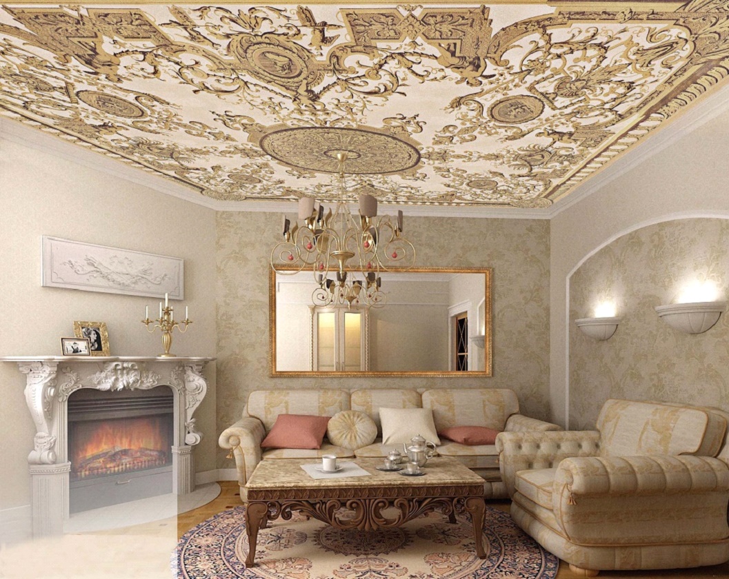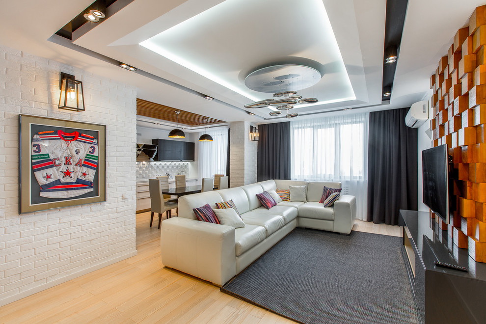 O teto da sala - uma parte importante do interior, afetando a percepção de todo o apartamento.
