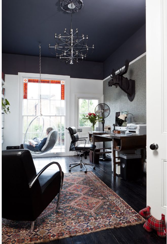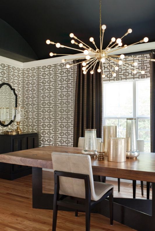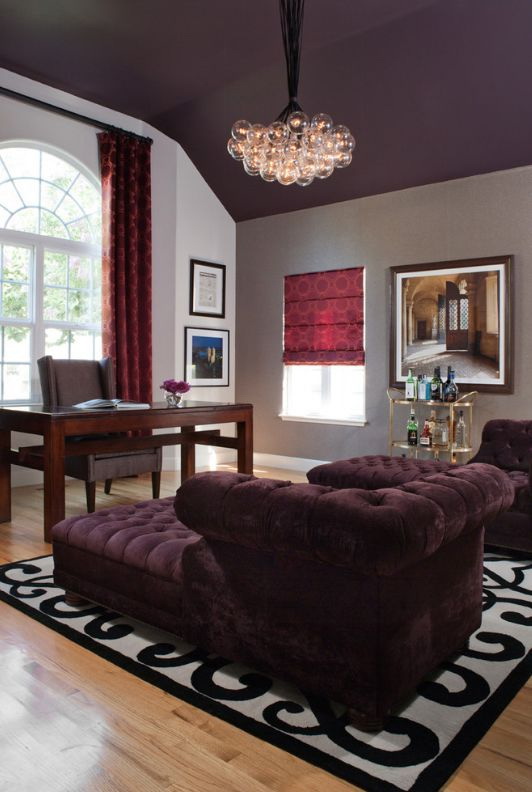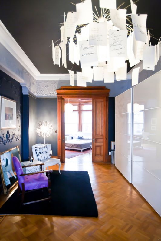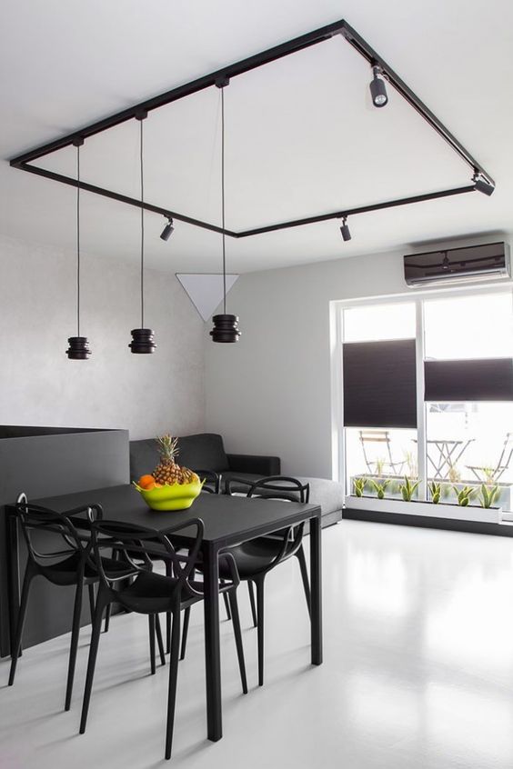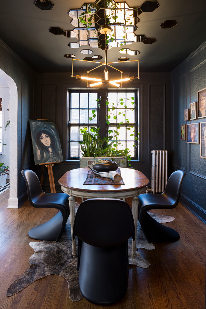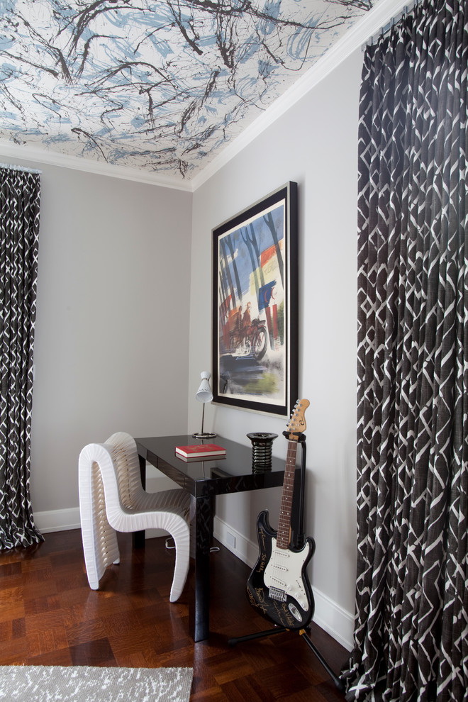 Ao criar contraste, em relação ao interior, acentos coloridos, você pode usar para isso não a área inteira, mas selecionar um fragmento. Por exemplo, com branco, um plinto de teto preto da mesma cor que o móvel pode ser usado.