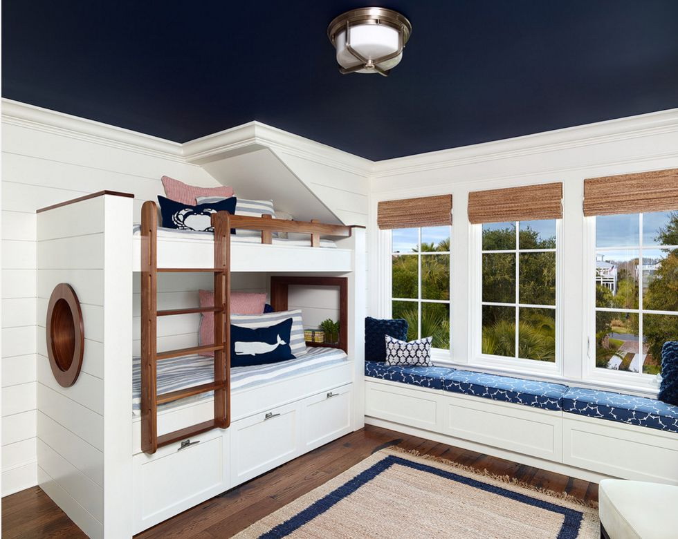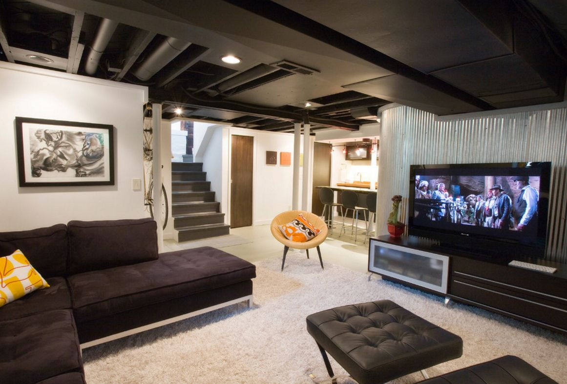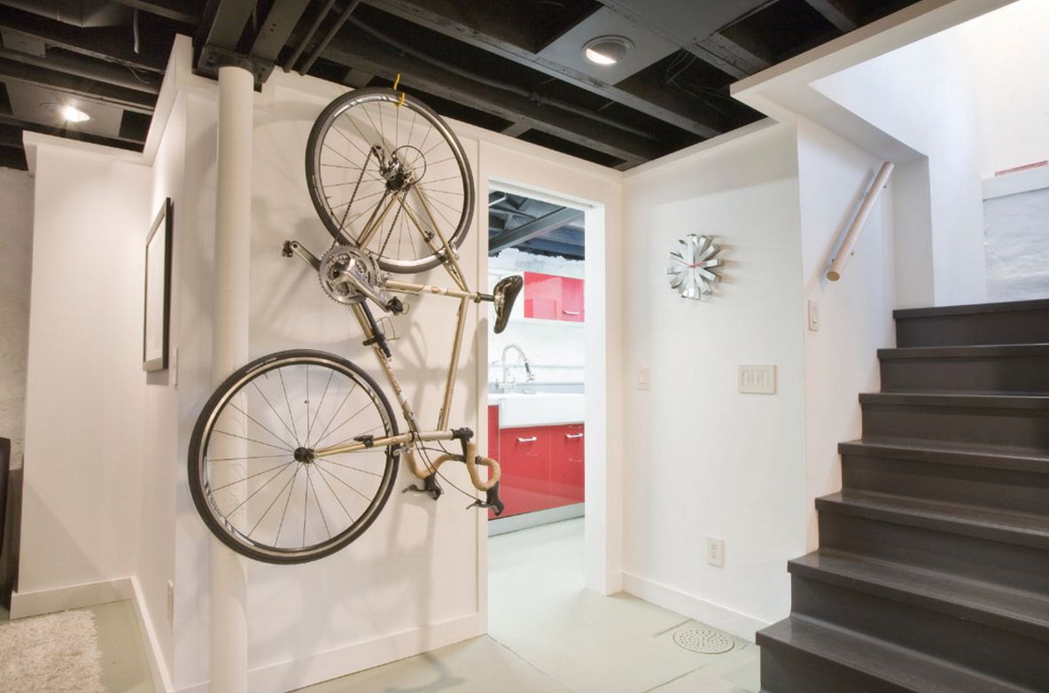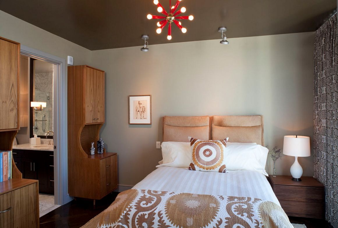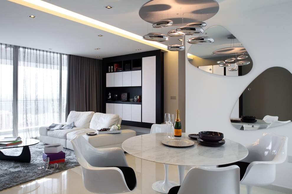 Ao criar contraste, em relação ao interior, acentos coloridos, você pode usar para isso não a área inteira, mas selecionar um fragmento. Por exemplo, com branco, um plinto de teto preto da mesma cor que o móvel pode ser usado.