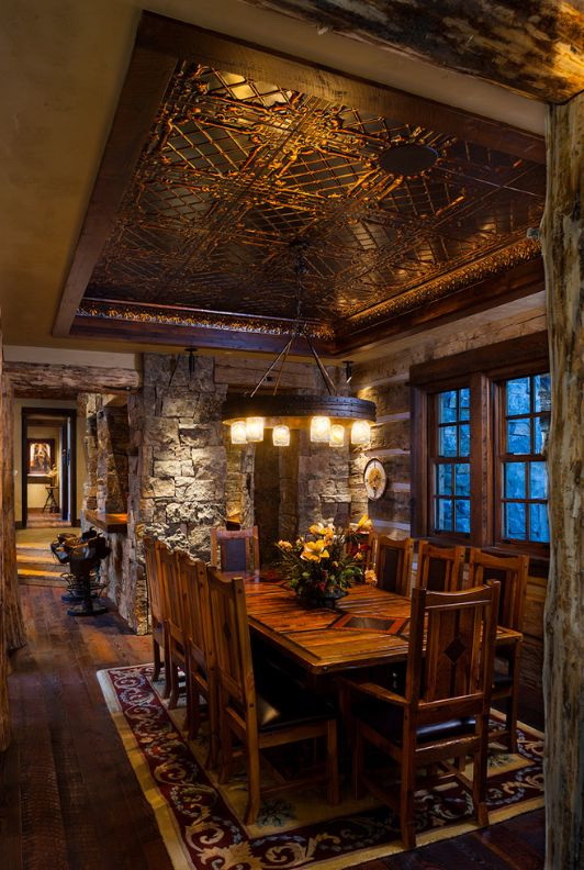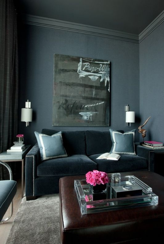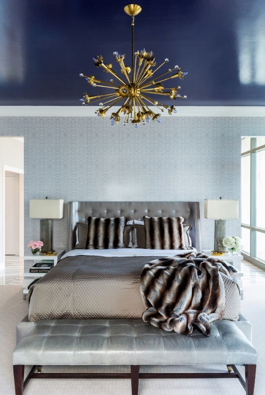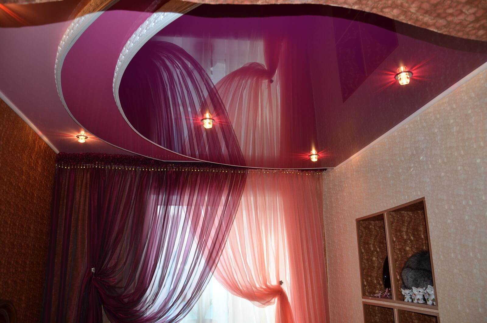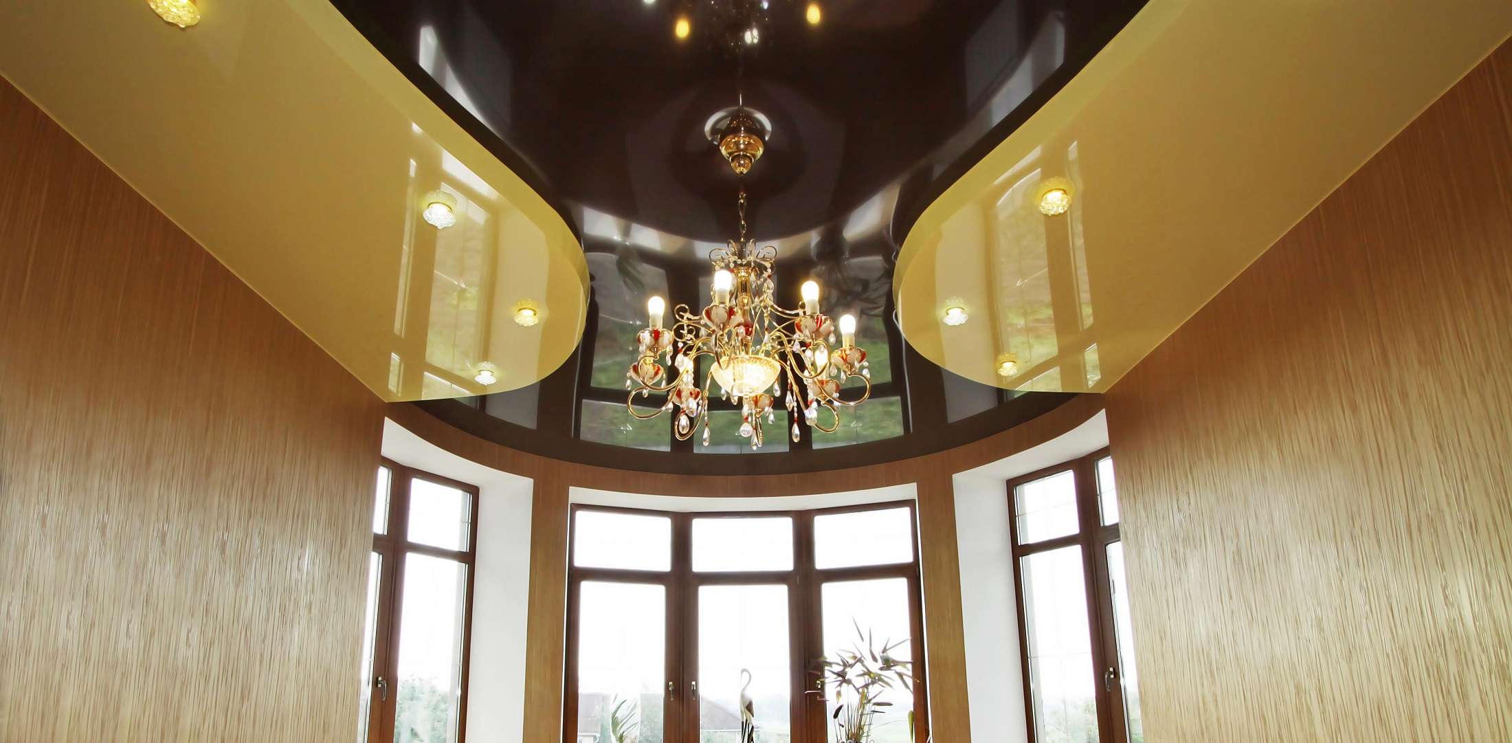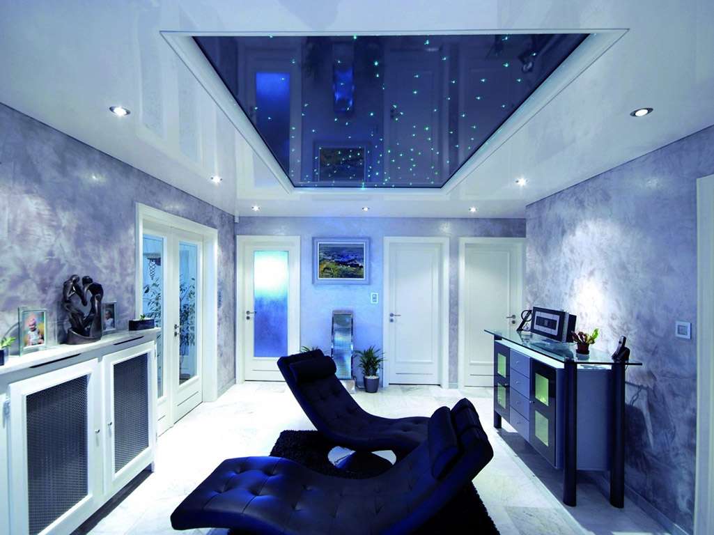 Tectos esticados de ricos tons profundos, por exemplo, azul ou castanho escuro, podem ter um efeito especial. Esta técnica permite obter uma aparência elegante e incomum - afinal, a cor da luz é familiar. Em cores escuras, o interior adquire notas de mistério e mistério.