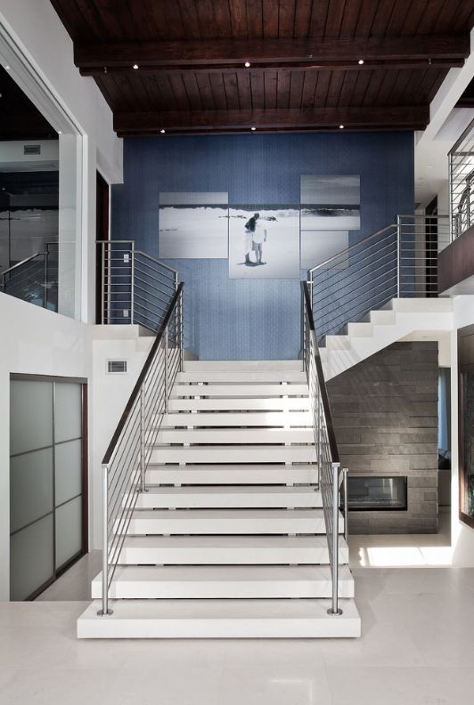 Drywall permite que você abaixe os tetos muito altos e crie uma iluminação incrivelmente bela. Este material permite incorporar a imaginação dos designers, pode ser usado em conjunto com a tensão, permite papel de parede e pintura.