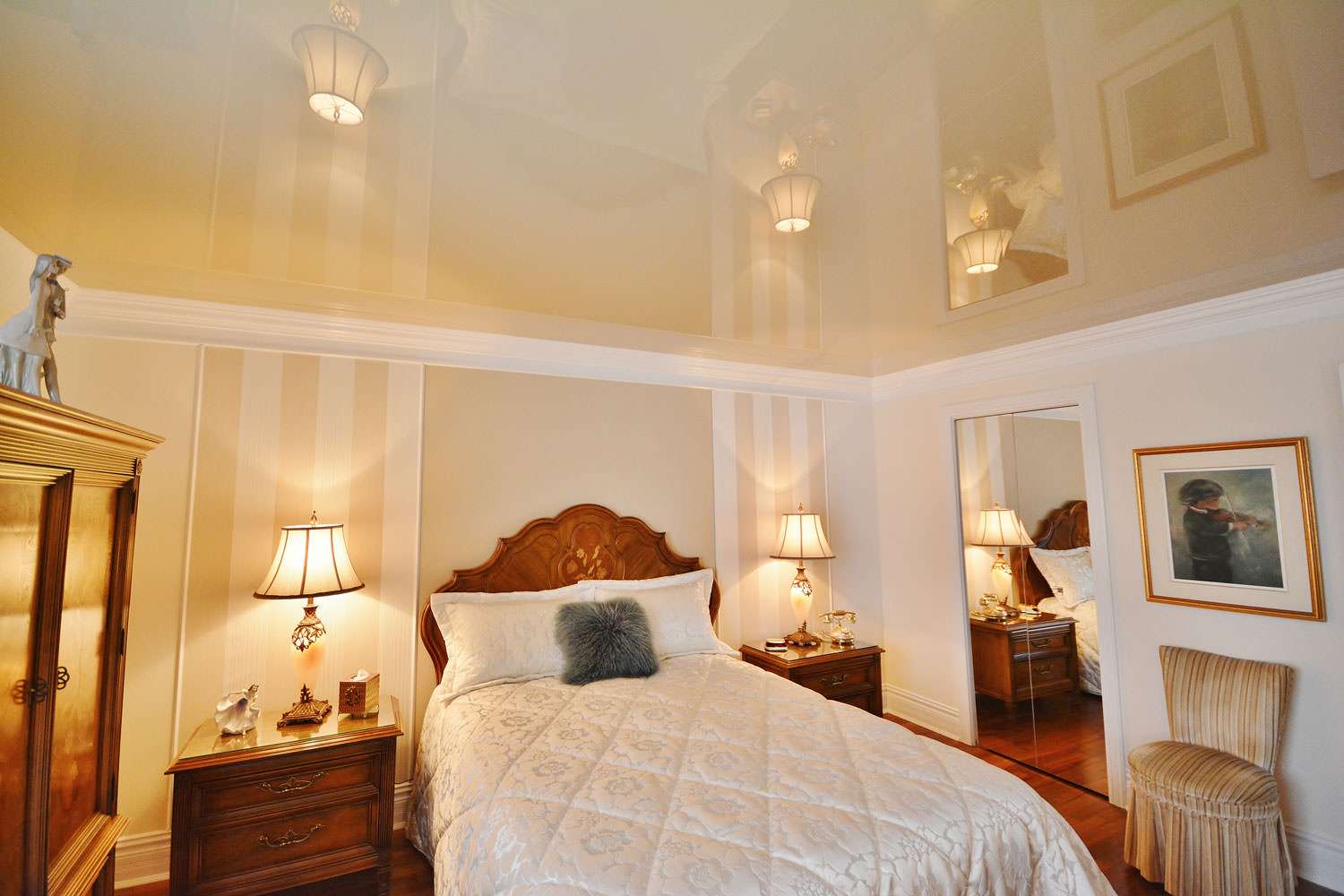 Sem inconvenientes, também não faz. Se a sala tiver uma área muito grande, o material de PVC terá uma costura soldada, ligeiramente perceptível, por exemplo, em superfícies brilhantes espelhadas. Nesse caso, você precisa se limitar a escolher: fosco ou acetinado.