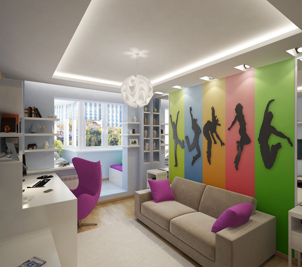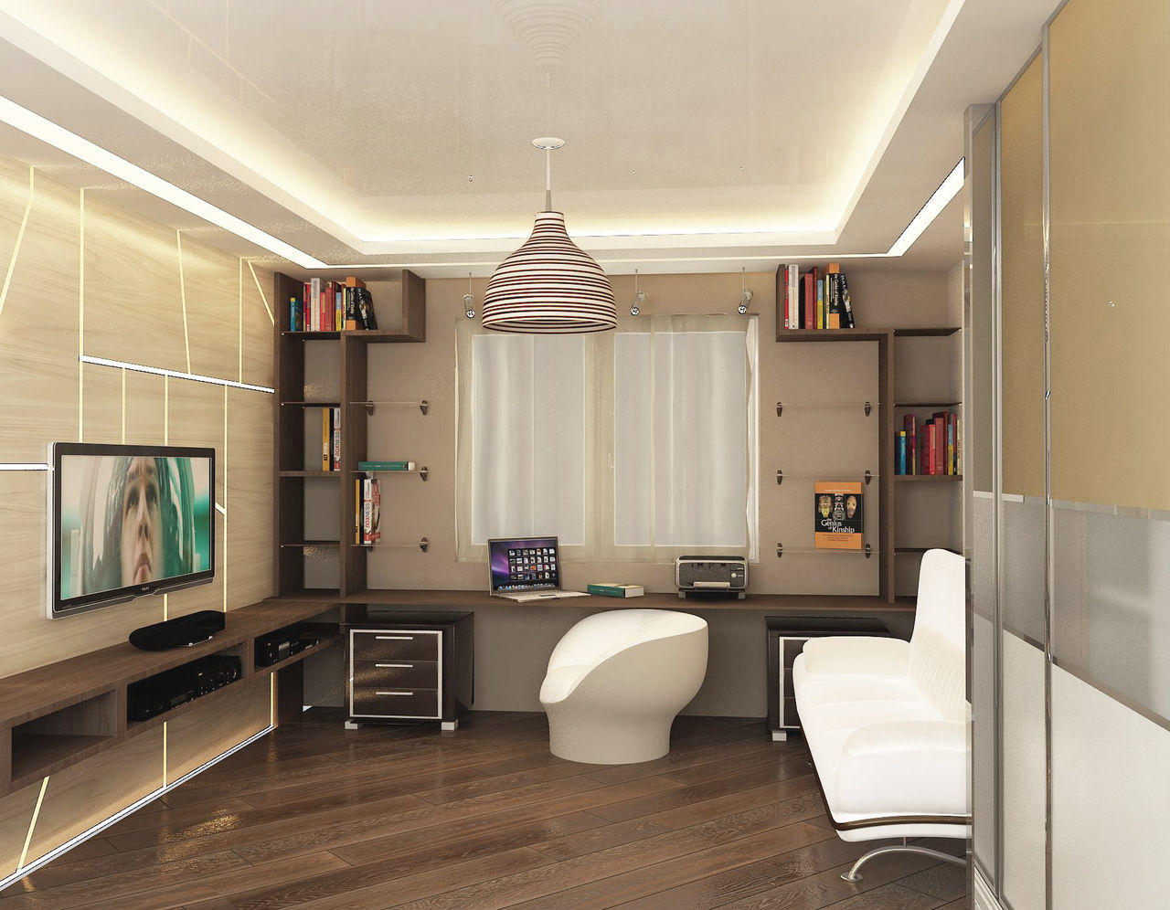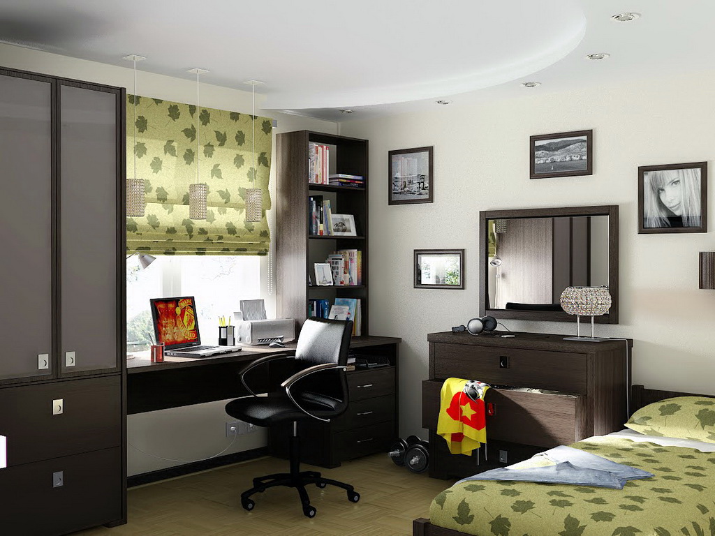 A iluminação adequada na sala do aluno é metade do sucesso. É necessário preservar a visão dos jovens trabalhadores, então instale um bom quarto o lustre com luz quente. O mesmo ponto se aplica à bagunça da sala. Melhor será um gabinete a menos, mas ao mesmo tempo a luz se espalhará uniformemente e a criança não se sentirá em um armário fechado.