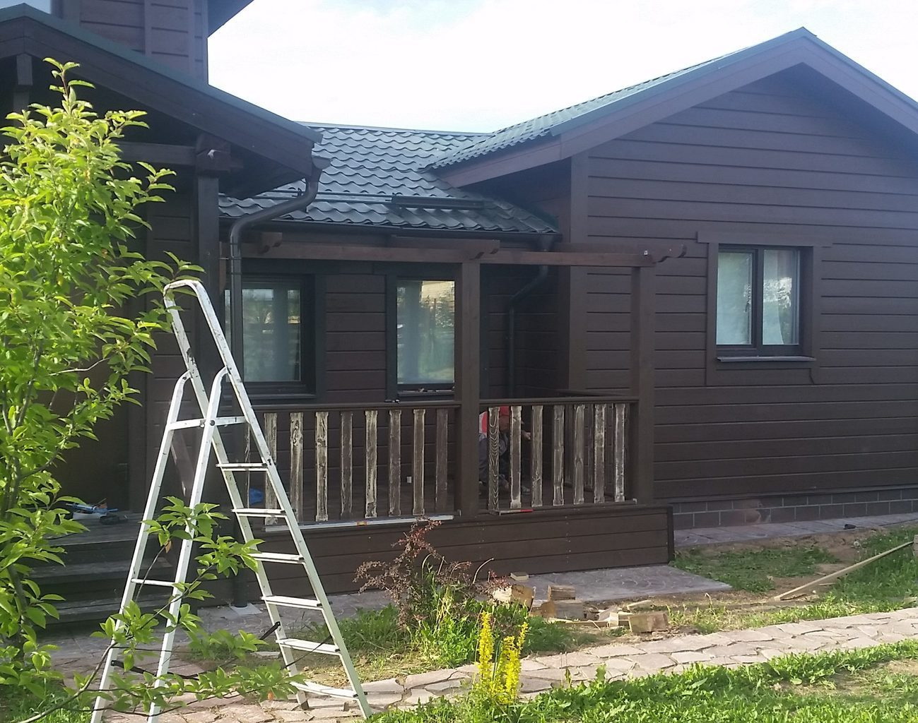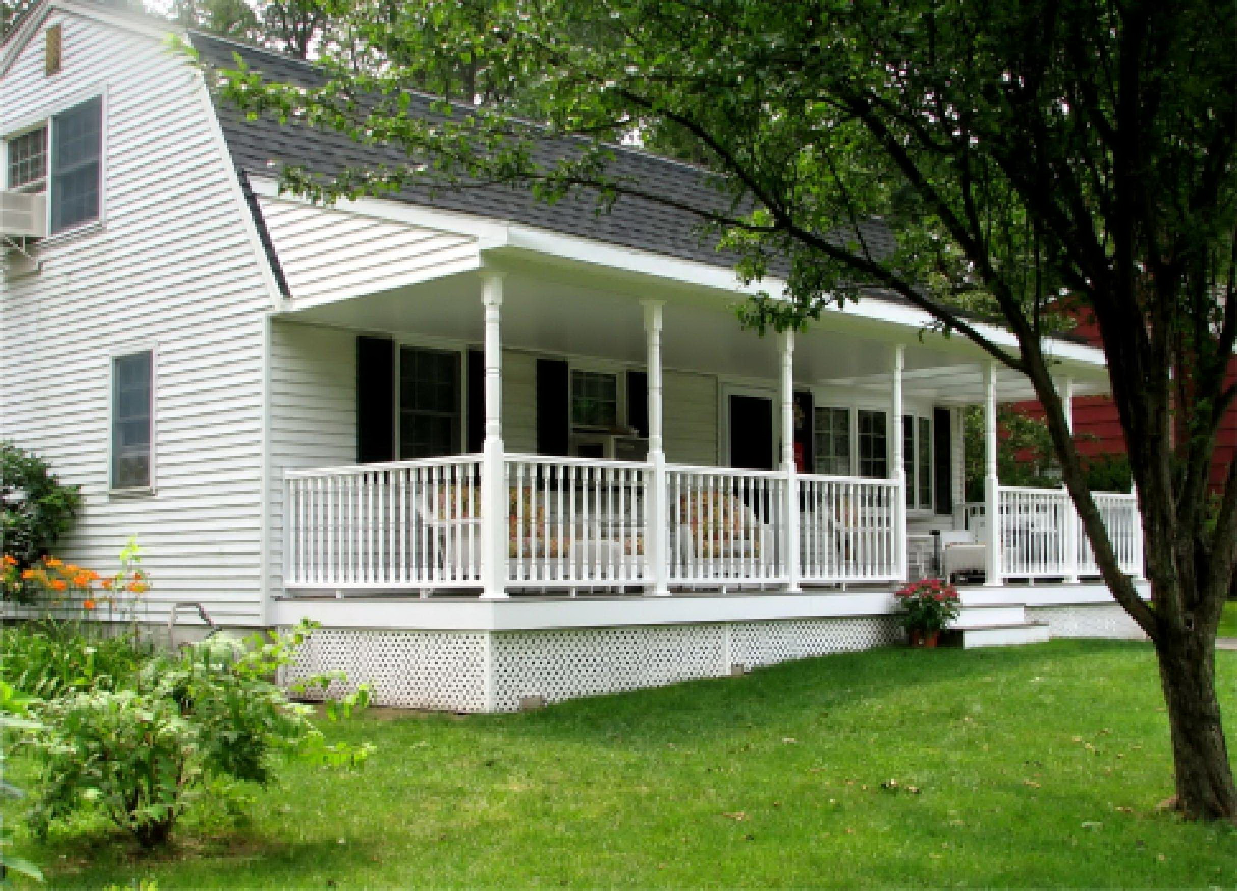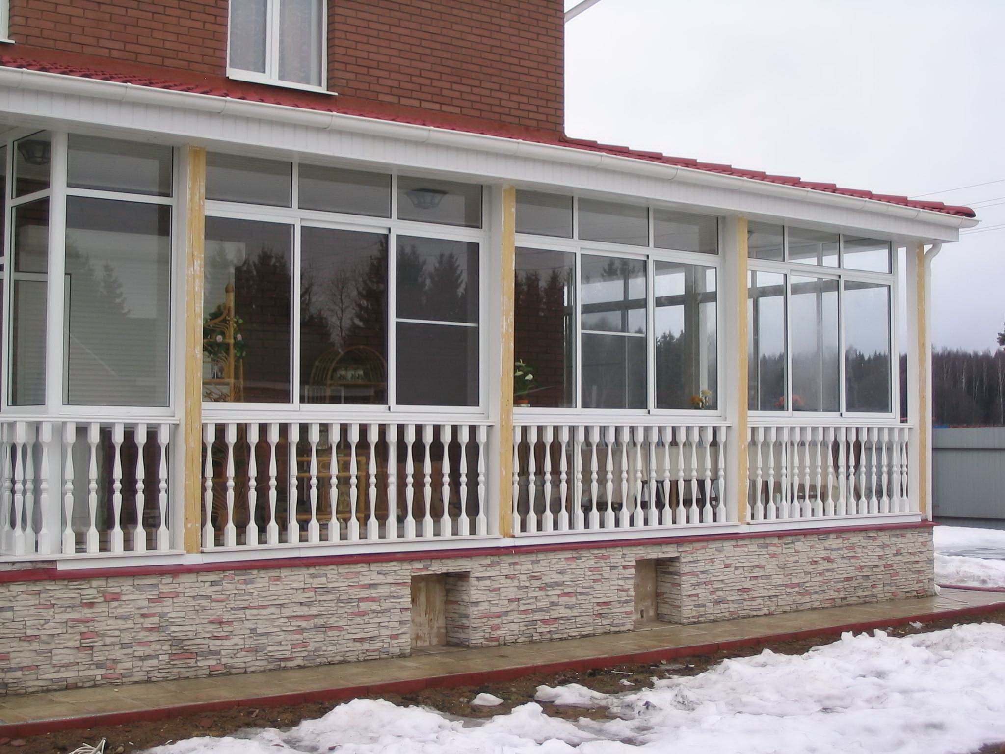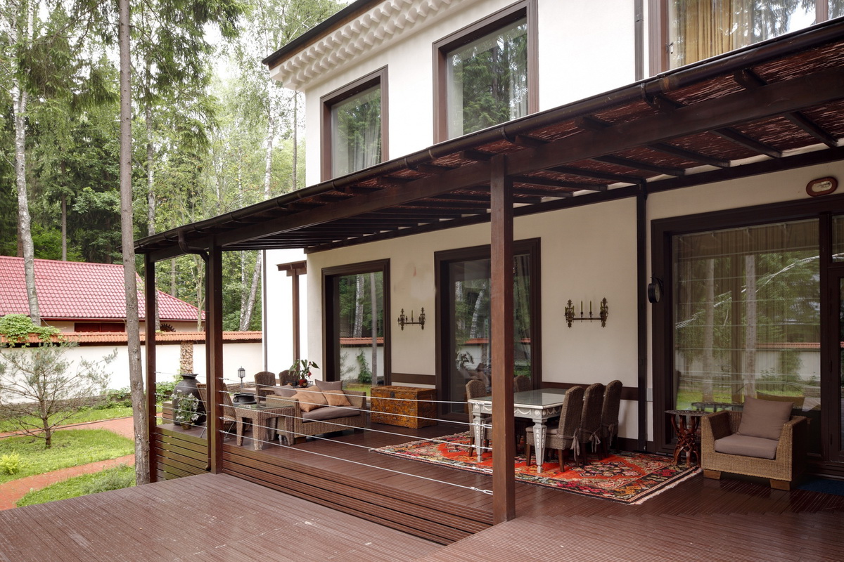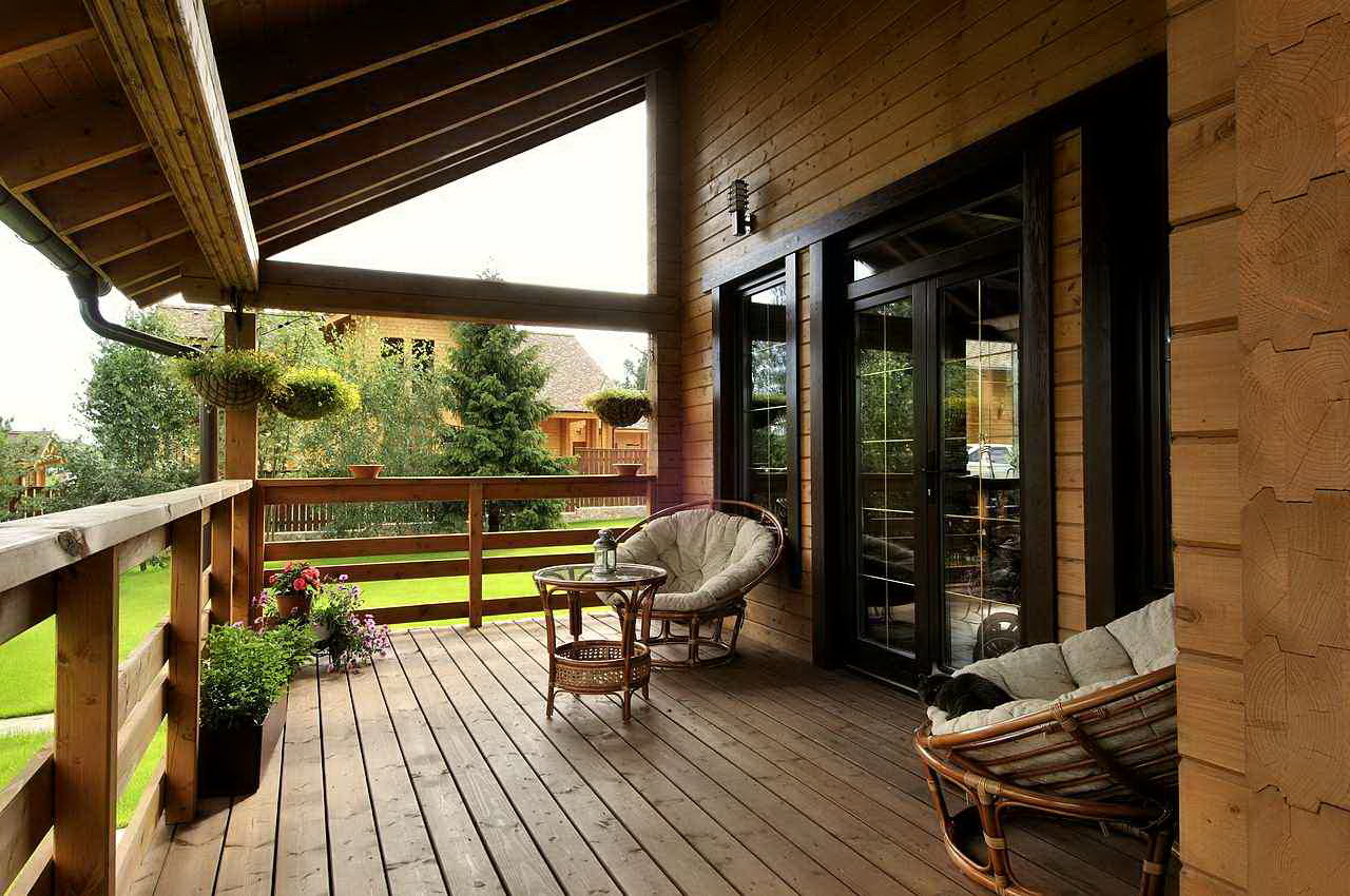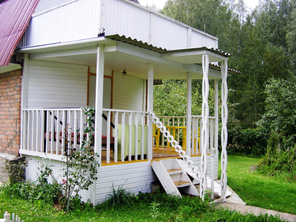 Quando o exterior terminar, a varanda deverá ter em conta o estilo geral da área local e os edifícios próximos. Dependendo do tipo de materiais utilizados para o projeto da fachada, tapume, tijolo, gesso fachada, madeira maciça eco-friendly: larch, pinho, freixo, faia ou carvalho são usados para decoração exterior do pórtico.