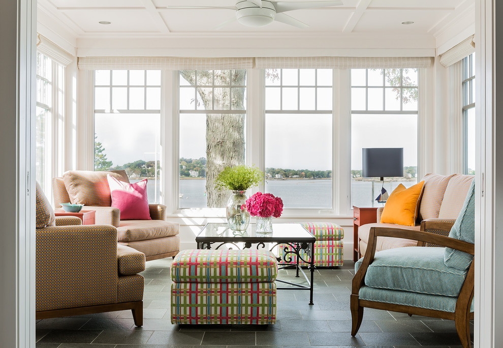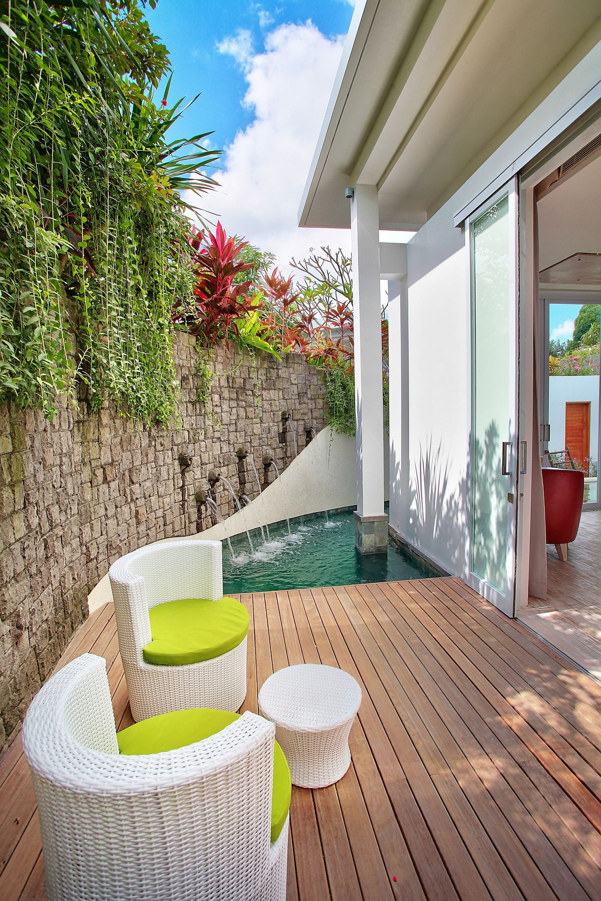 É possível adicionar tal interior com escaladores e tecidos brilhantes. As plantas podem ser colocadas em vasos pendurados ou assentes em banheiras. Uma pequena fonte portátil em um dia quente de verão saturará a sala com umidade.