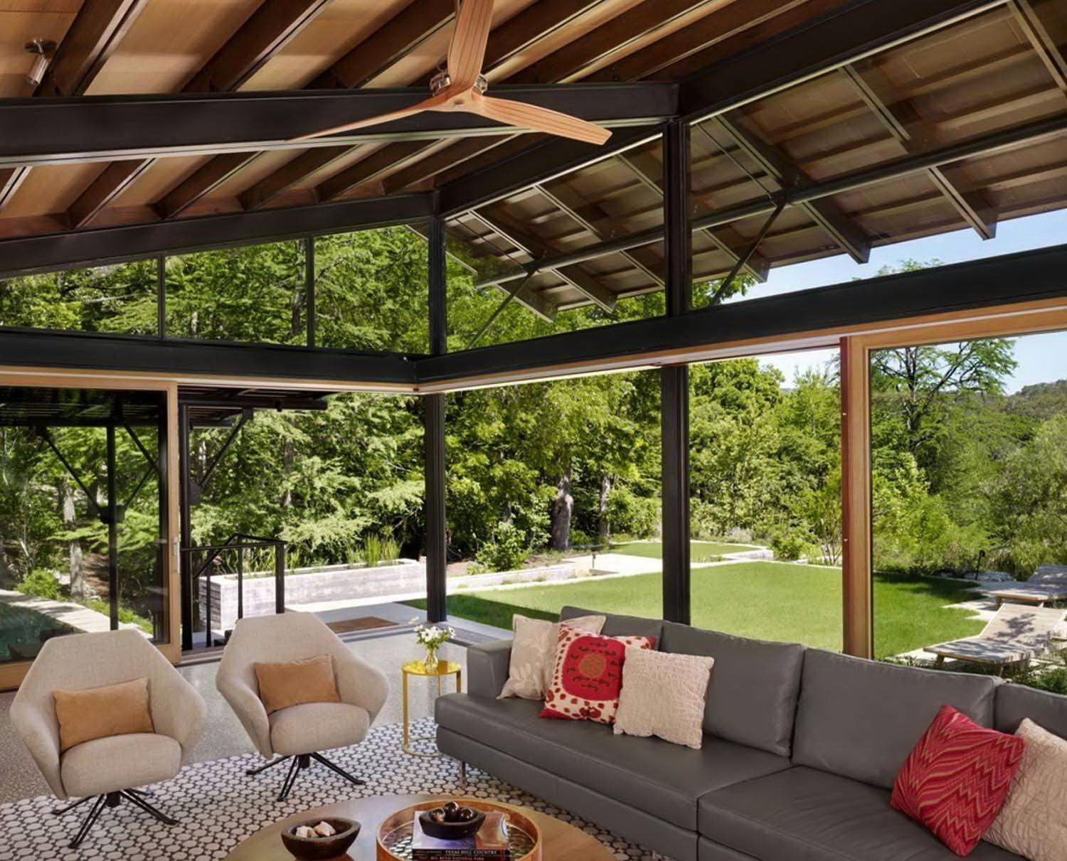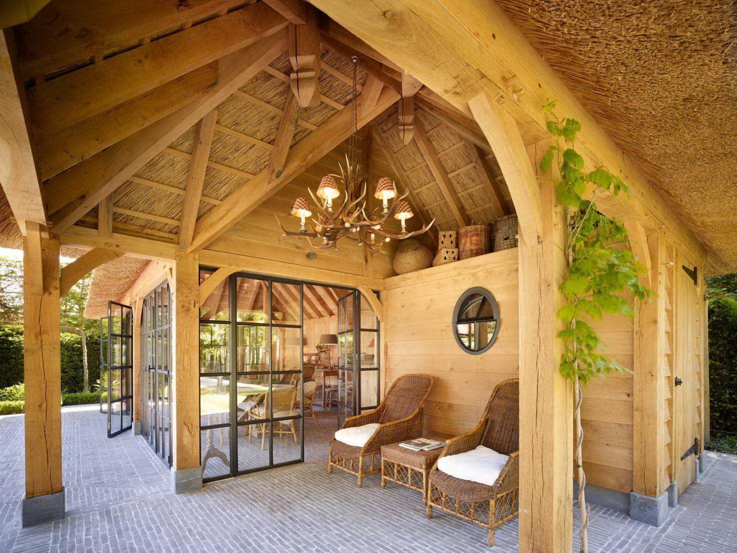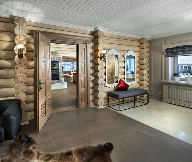 - vigas de teto em estilo rústico maciço olharão bastante harmoniosamente contra o pano de fundo das janelas modernas de vidraça de vidro; uma das paredes da sala pode ser cortada sob a pedra, trazendo uma vida rural regular para o ambiente moderno;