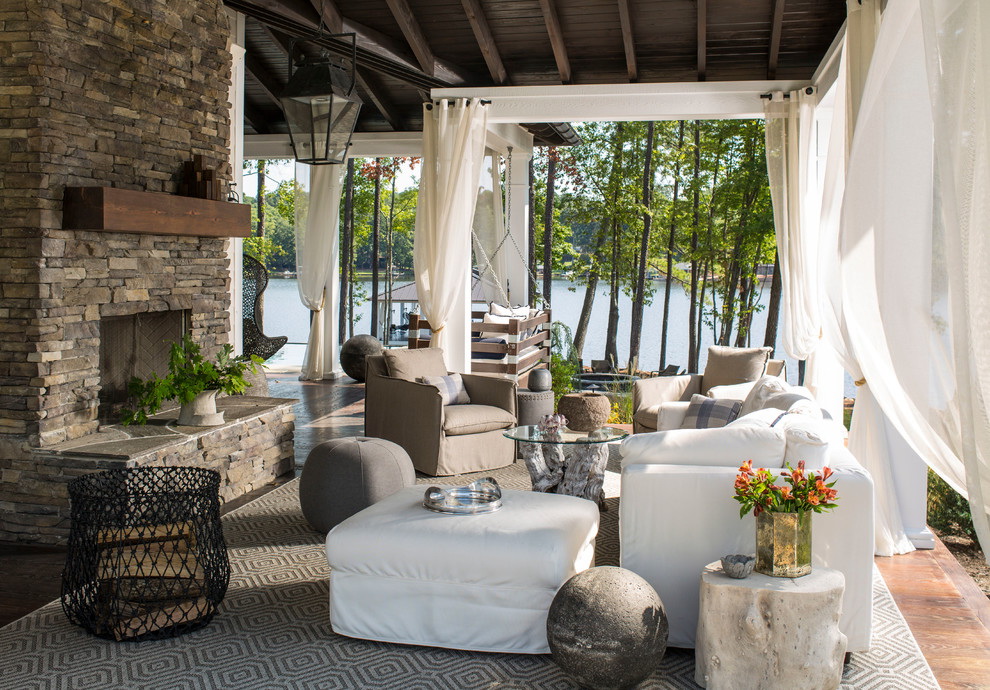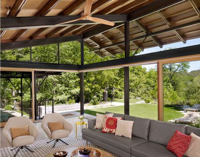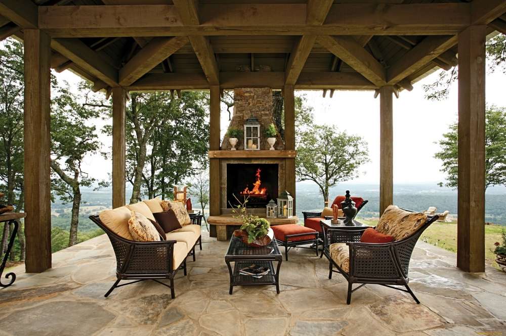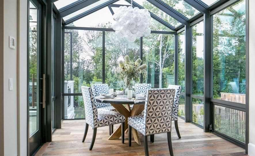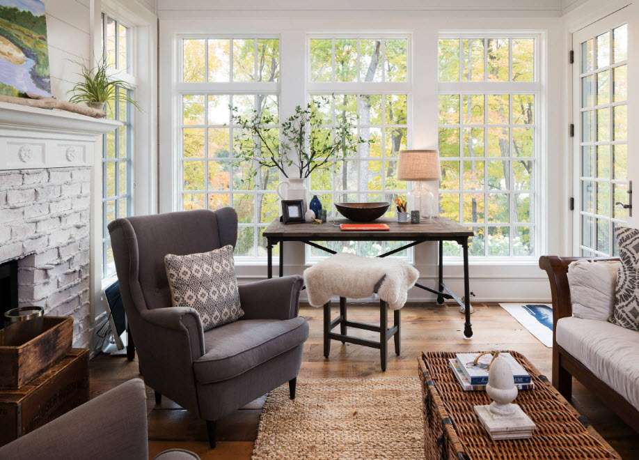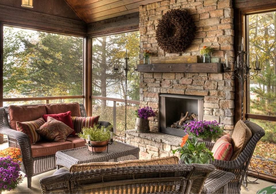 Opções de design para tal sala são infinitas. Um estilo inglês cheio de babados, um império ou um clássico em uma varanda ao ar livre obviamente não dará em nada. Para decorar o interior de tal sala, é mais razoável usar madeira, pedra natural ou artificial, tijolo, vidro e metal: