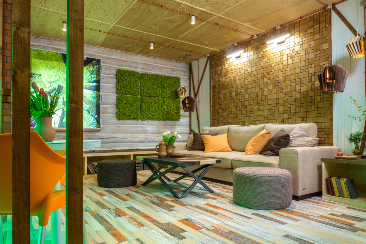 - Telhas de cortiça de vários tamanhos - usando telhas de cortiça criaram padrões complexos, visualmente dividiram a sala.