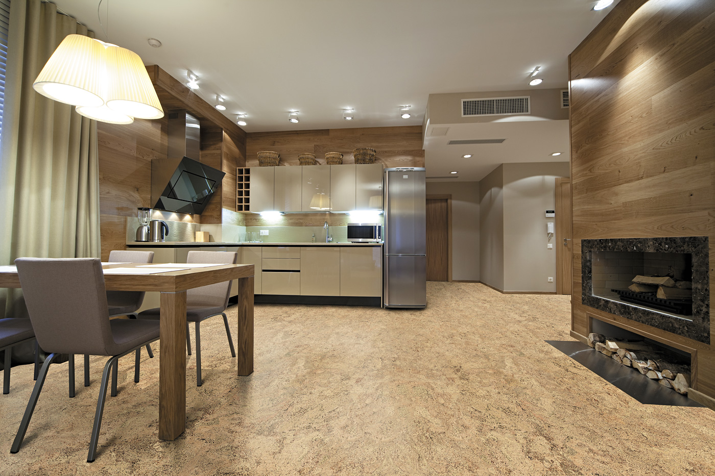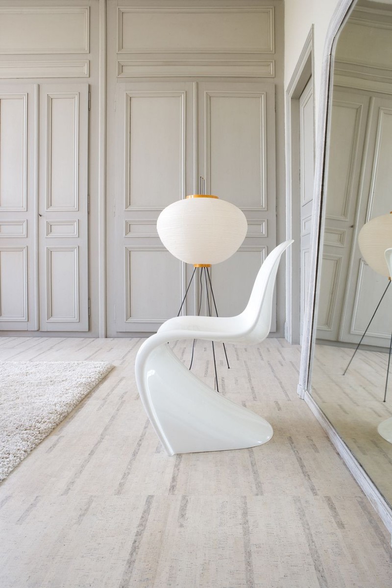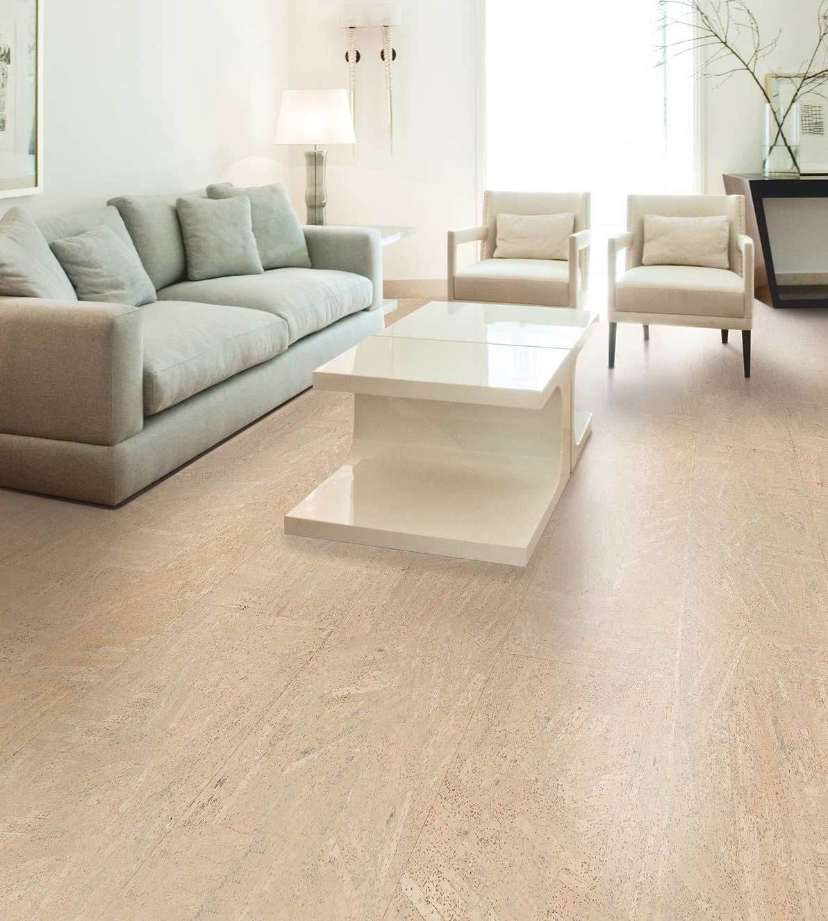 Utilizar uma combinação de cortiça e laminado pode resolver o problema do zoneamento. Por exemplo, para dividir a mesma sala de estar e corredor. Então você pode fazer um piso de cortiça de onda suave perto do arco ou da porta da sala de estar. Se você pegar um laminado leve, será interessante olhar com a cor da areia da cortiça, e a linha de separação será desenhada.