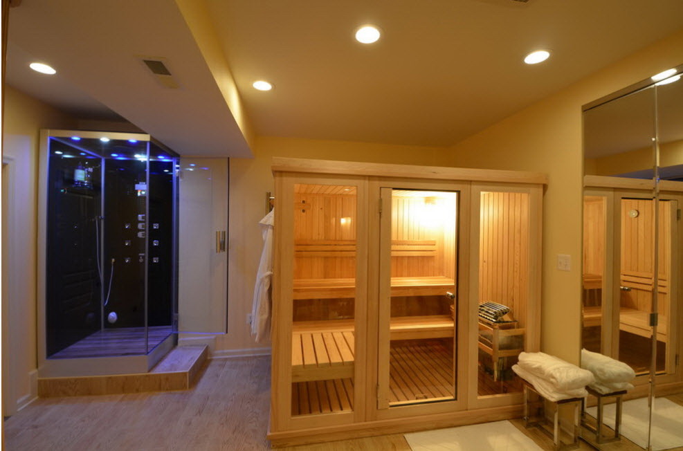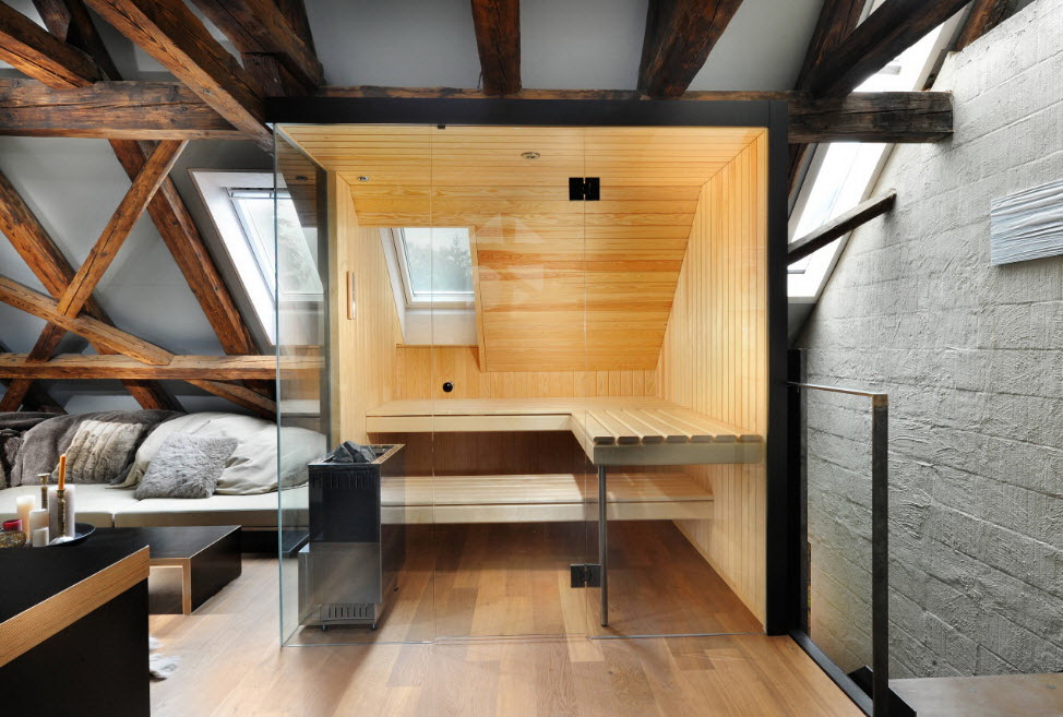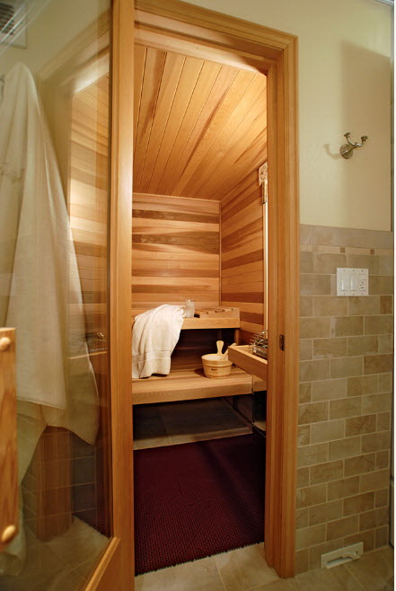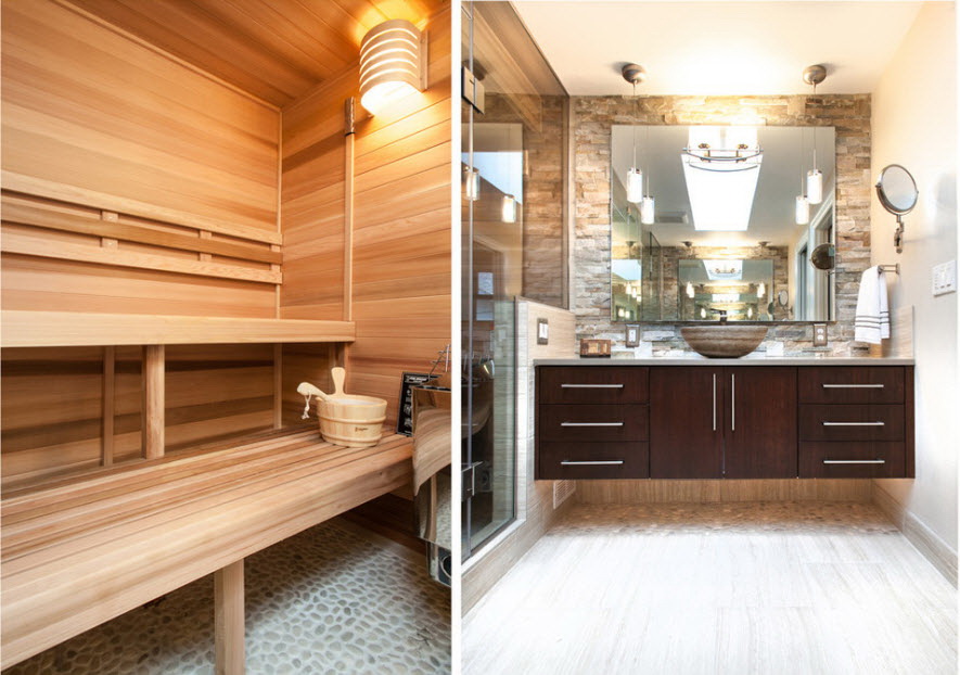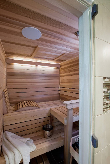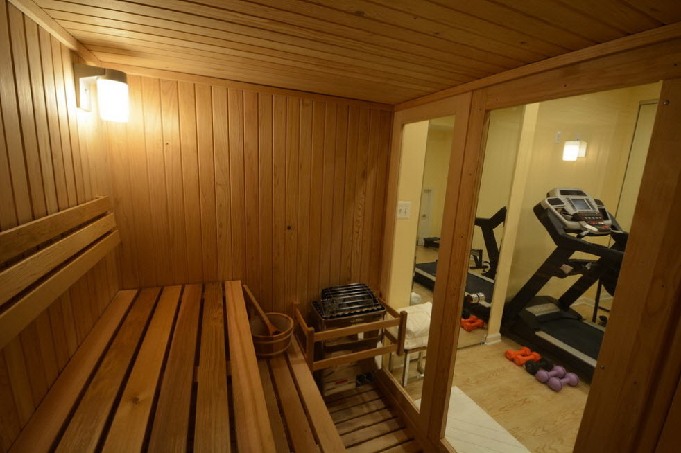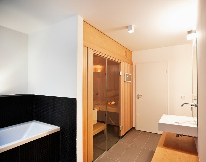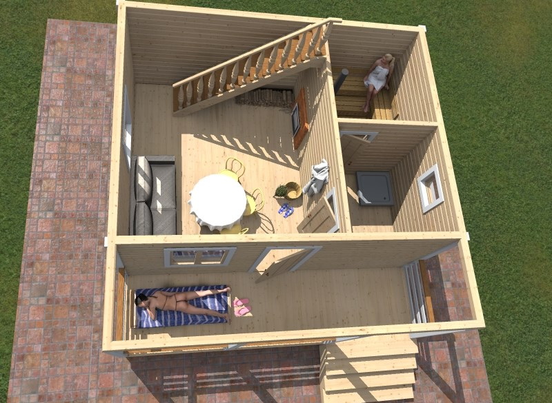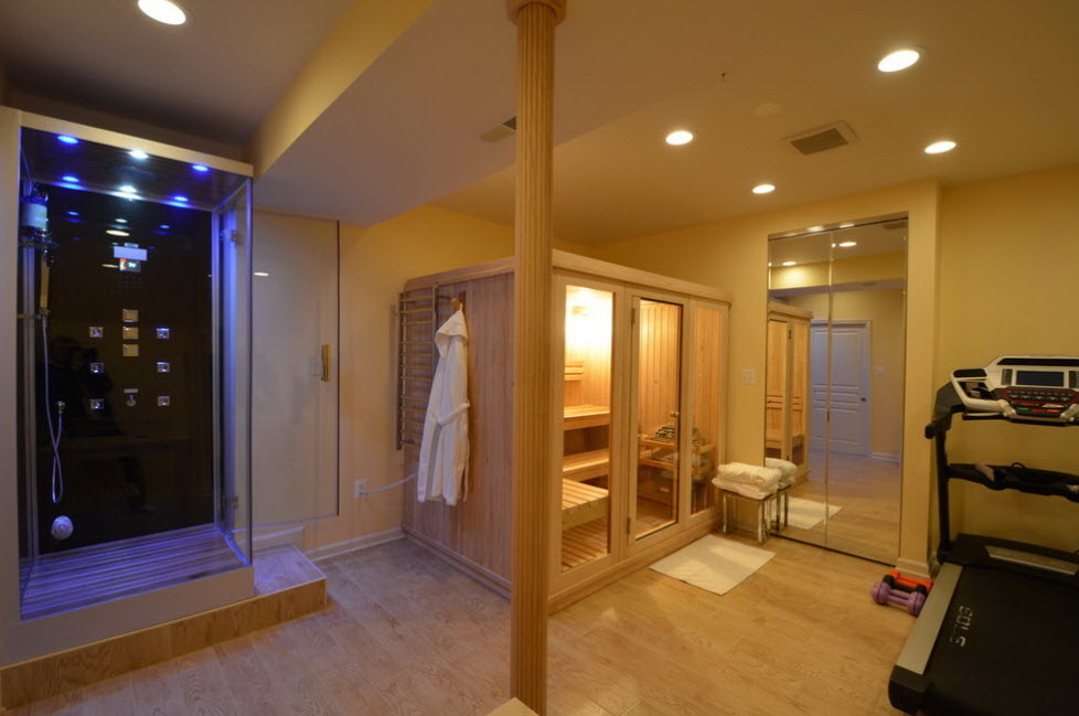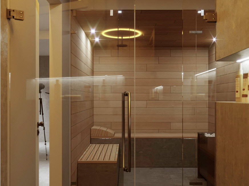 A sala de vapor, chuveiro e chuveiro deve ter uma entrada separada. Premissas técnicas são separadas do resto. O quarto ou sala de recreação está localizado no sótão, o que leva escada. É equipado com uma grade estável e degraus de revestimento antiderrapante. Se uma piscina estiver disposta na banheira, ela será combinada com salas para tratamento de água e acesso ao terraço.