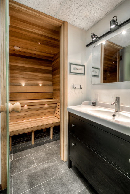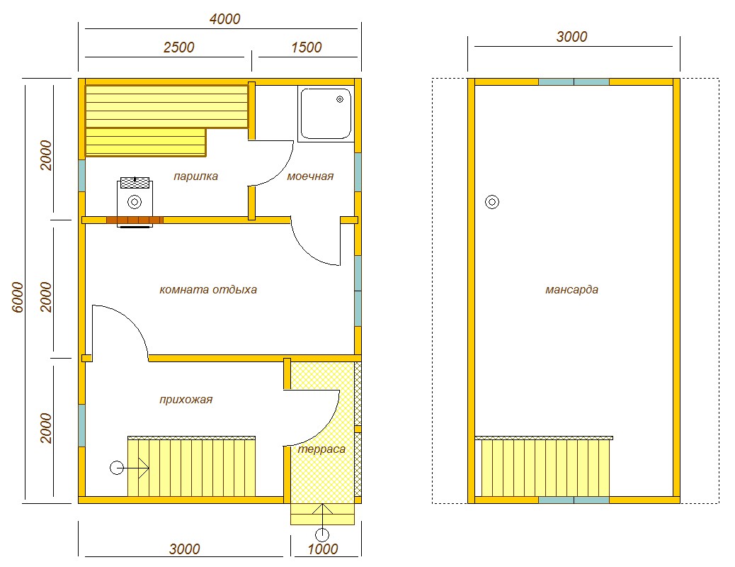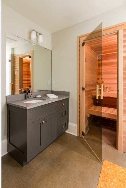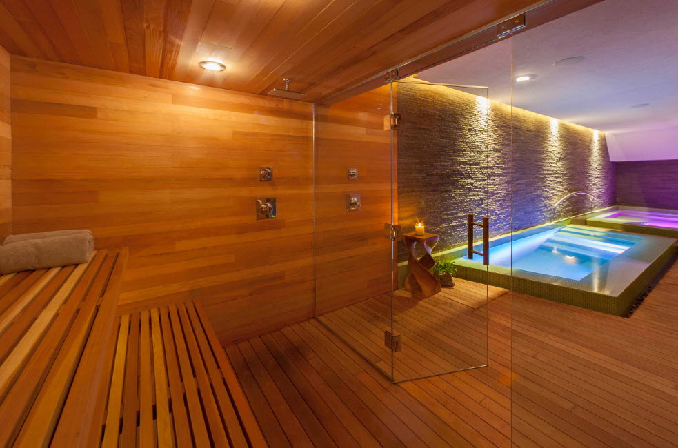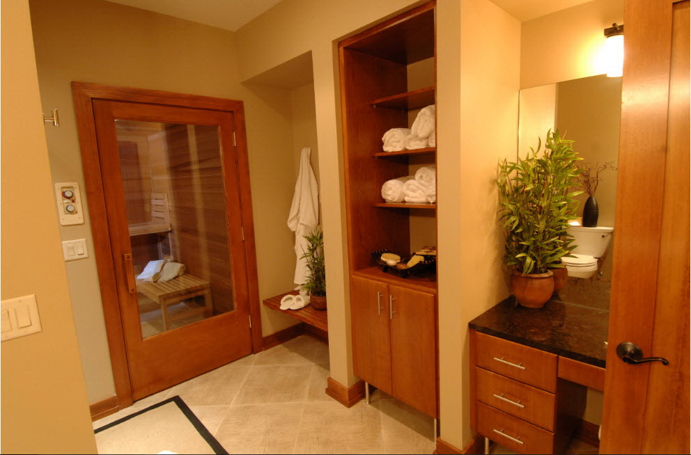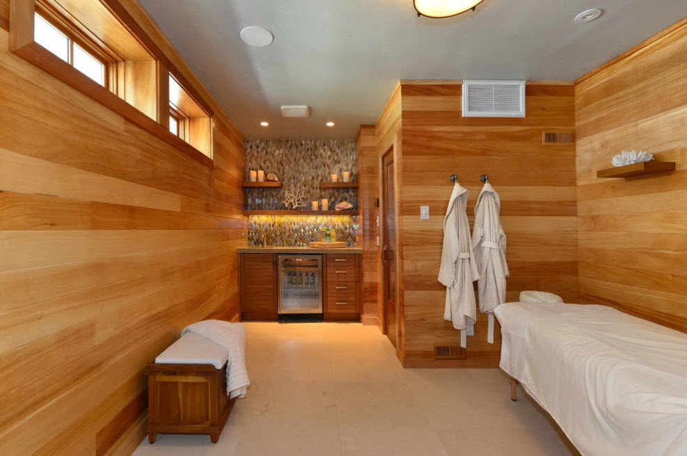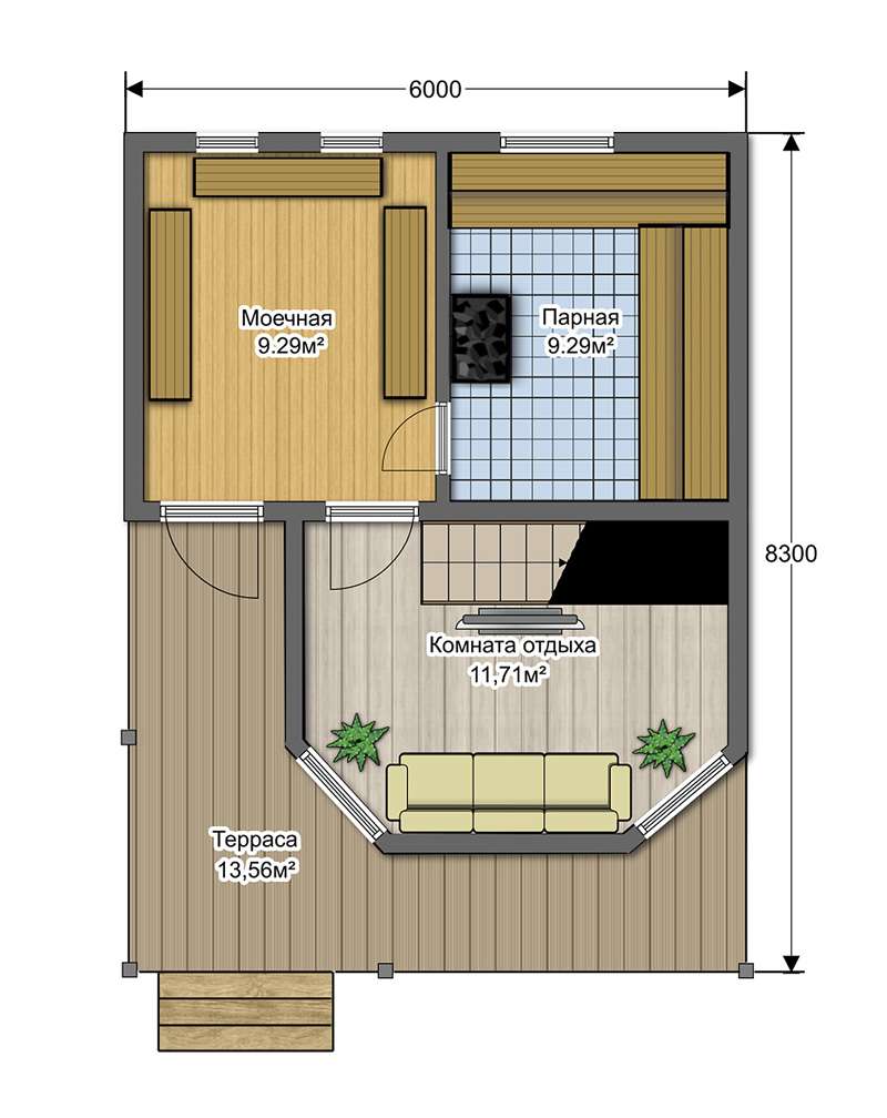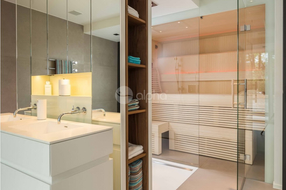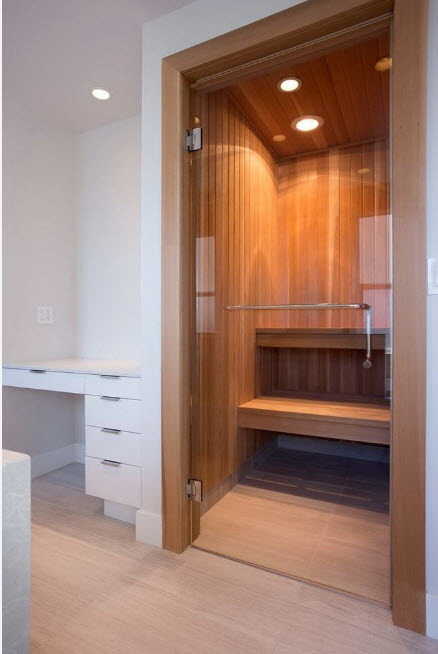 A sala de vapor, chuveiro e chuveiro deve ter uma entrada separada. Premissas técnicas são separadas do resto. O quarto ou sala de recreação está localizado no sótão, o que leva escada. É equipado com uma grade estável e degraus de revestimento antiderrapante. Se uma piscina estiver disposta na banheira, ela será combinada com salas para tratamento de água e acesso ao terraço.