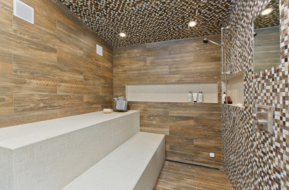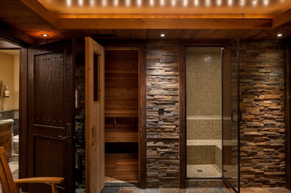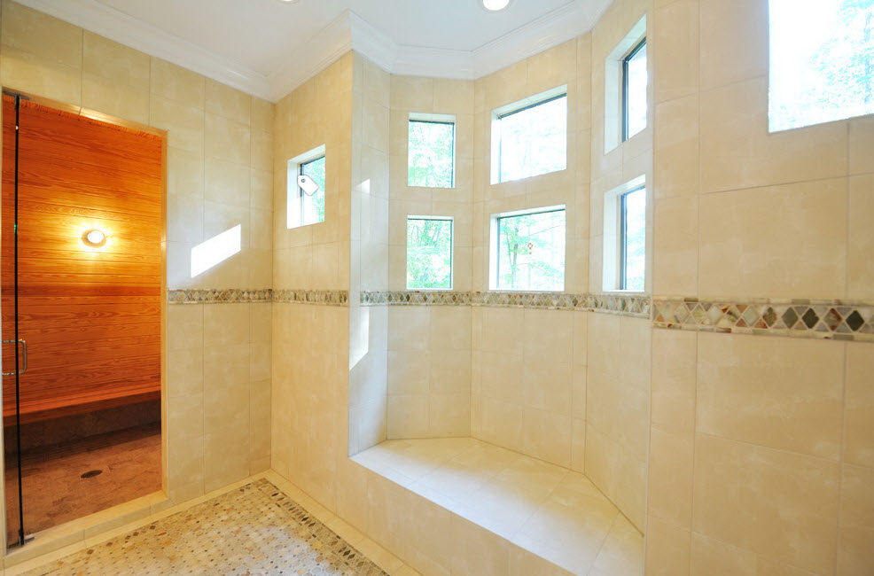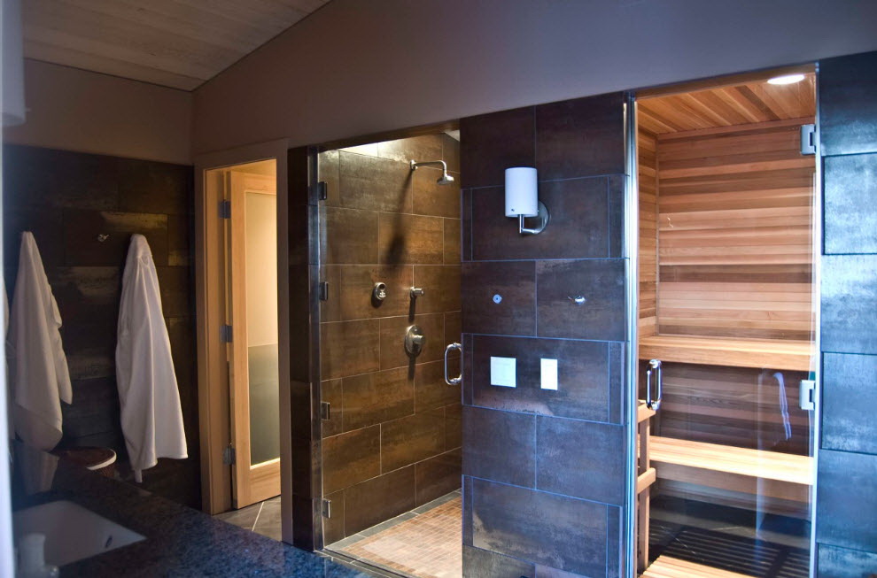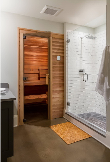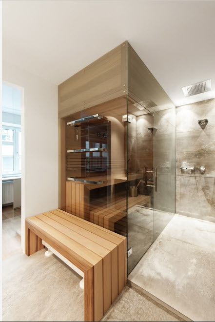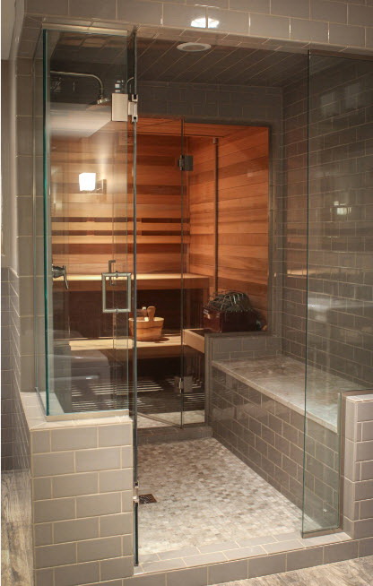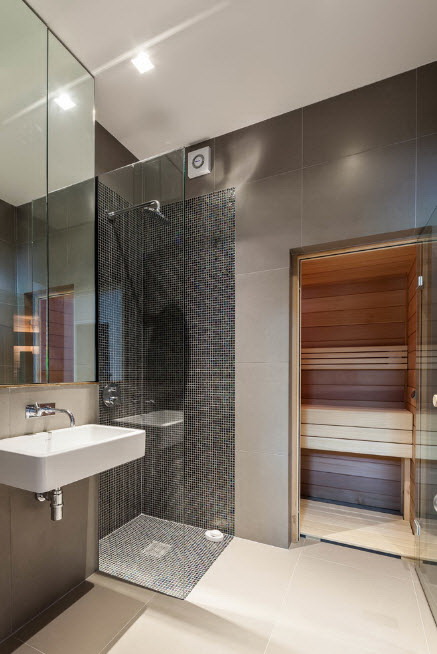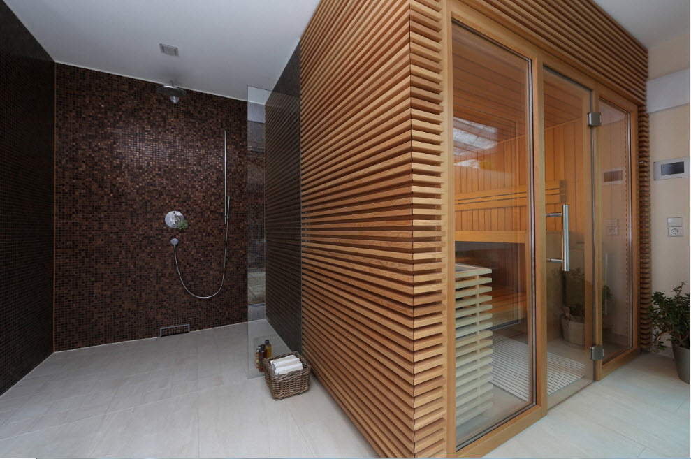 Na temperatura do chuveiro é menor do que na sala de vapor, mas alta umidade. Pedra, azulejo e madeira podem ser adicionados: