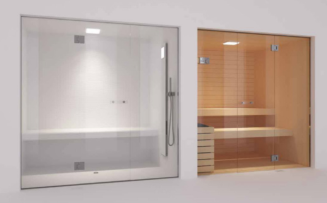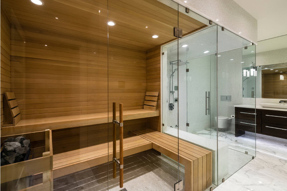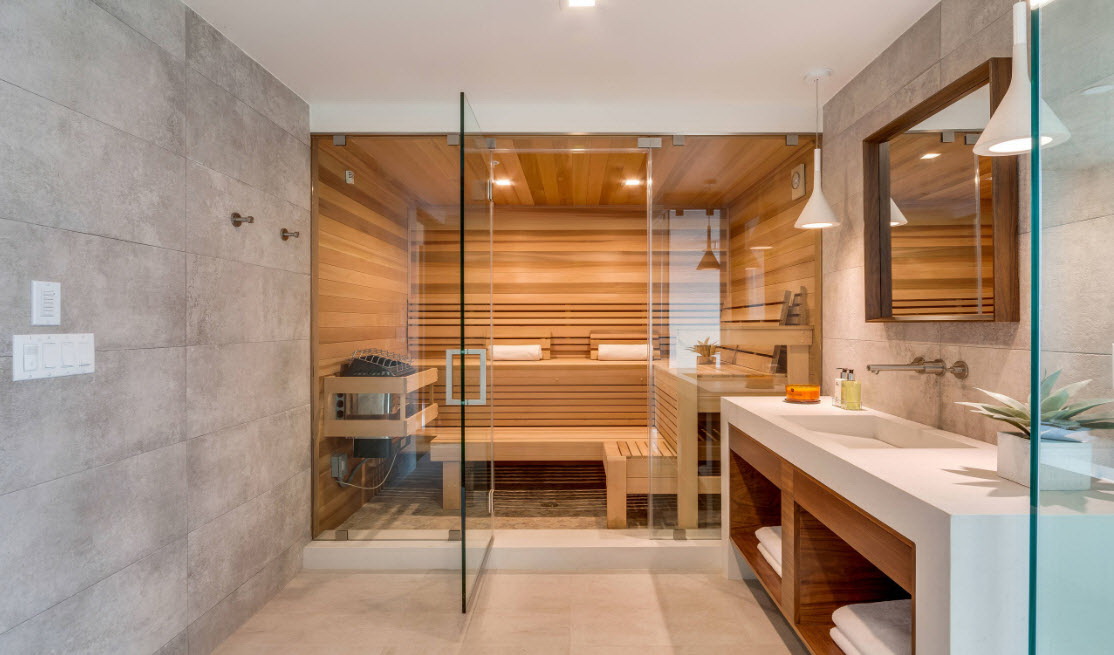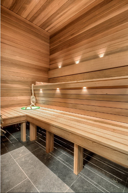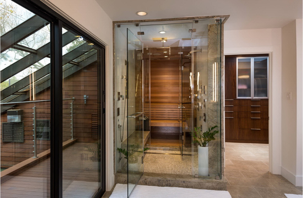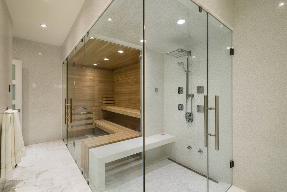 Na temperatura do chuveiro é menor do que na sala de vapor, mas alta umidade. Pedra, azulejo e madeira podem ser adicionados: