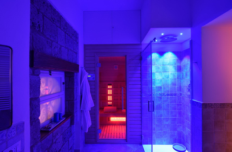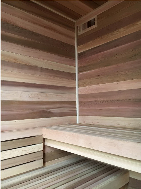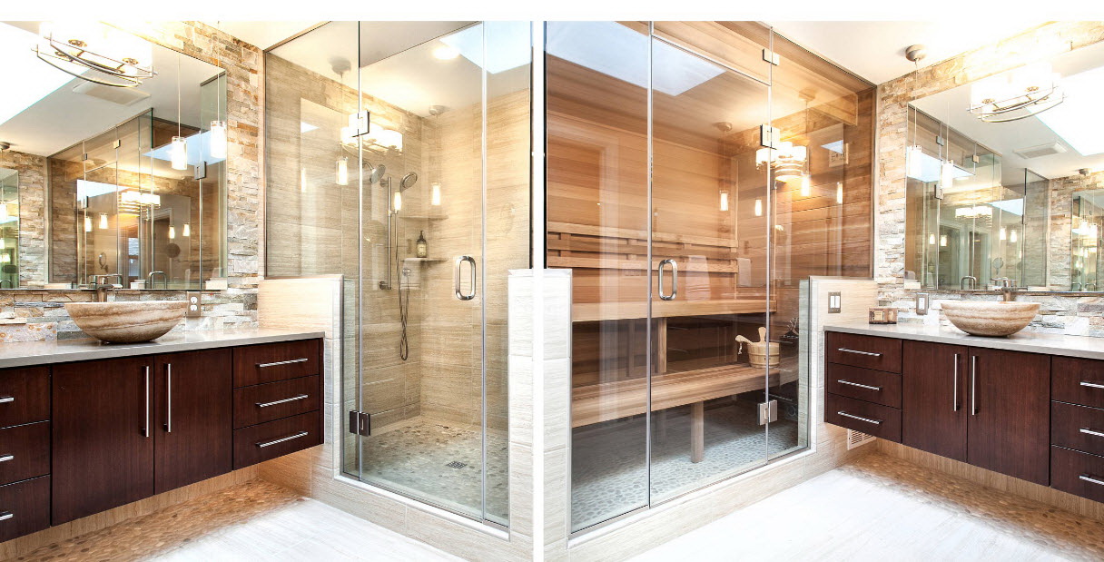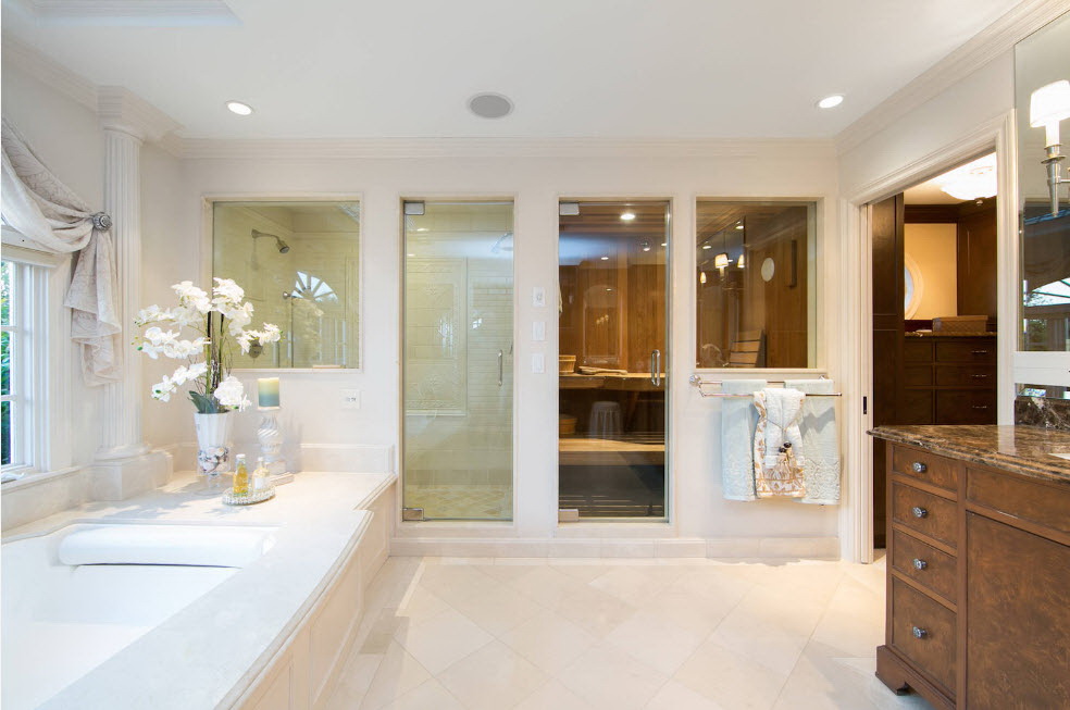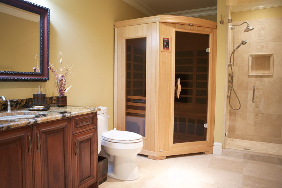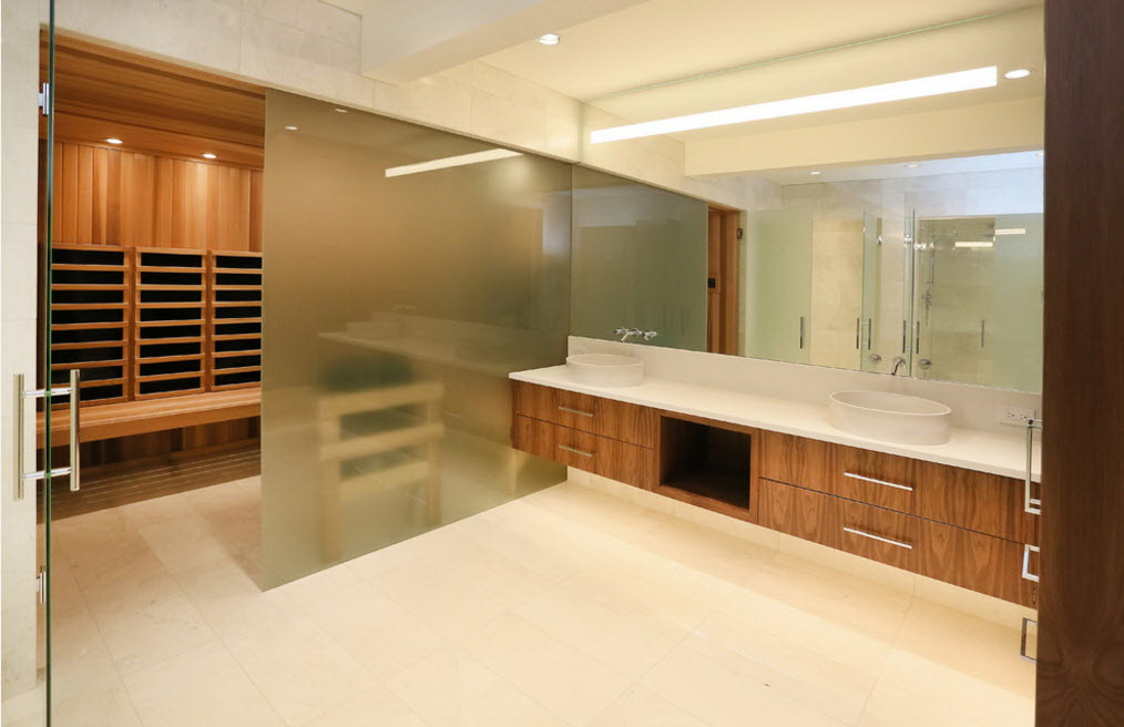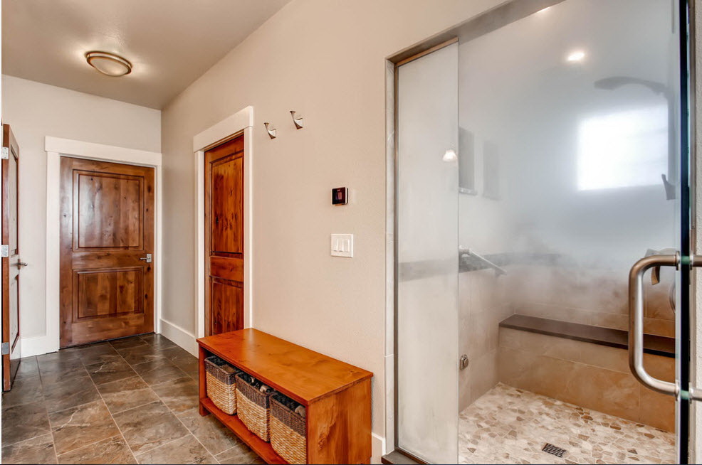 Na temperatura do chuveiro é menor do que na sala de vapor, mas alta umidade. Pedra, azulejo e madeira podem ser adicionados: