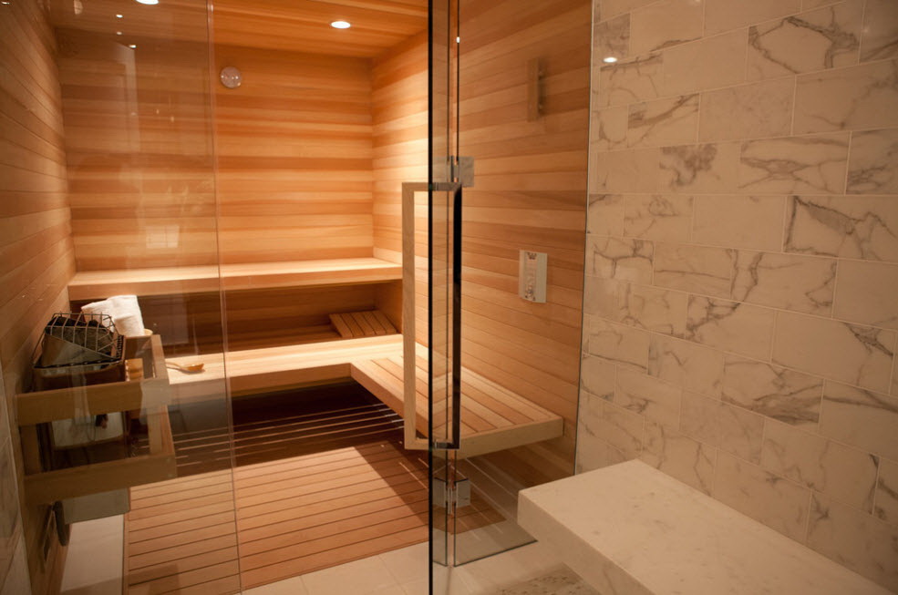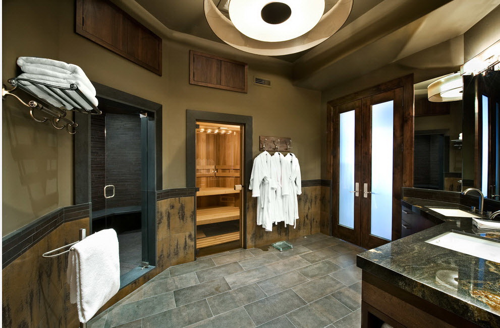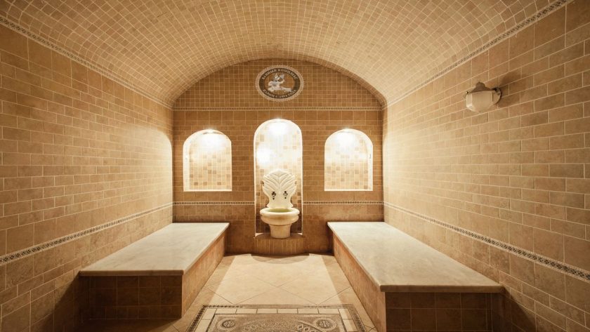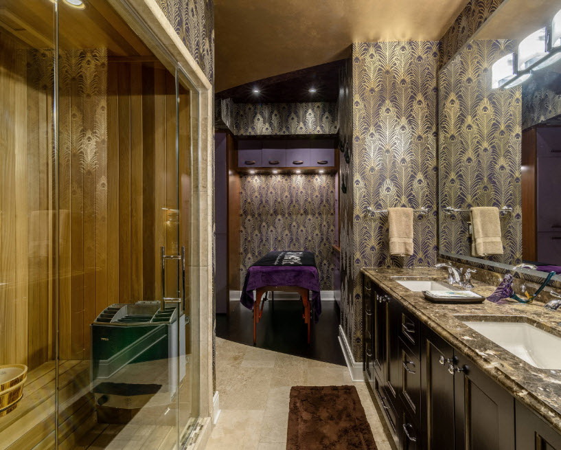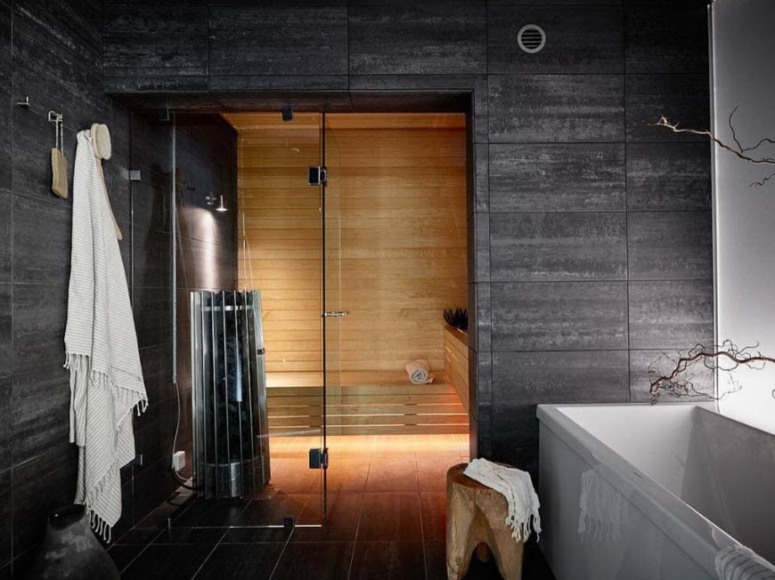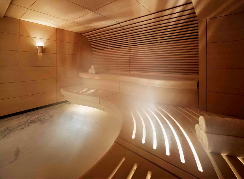 - Hammam turco - o calor é fornecido pela tubulação aquecida, que passa pelas paredes ao longo do perímetro da sala. A temperatura não excede 55 °, o que é confortável para pessoas que não toleram calor. O vapor é emitido através de canais especiais a uma altura de 1,5 m Mármore, pedra natural e azulejo dominam a decoração.