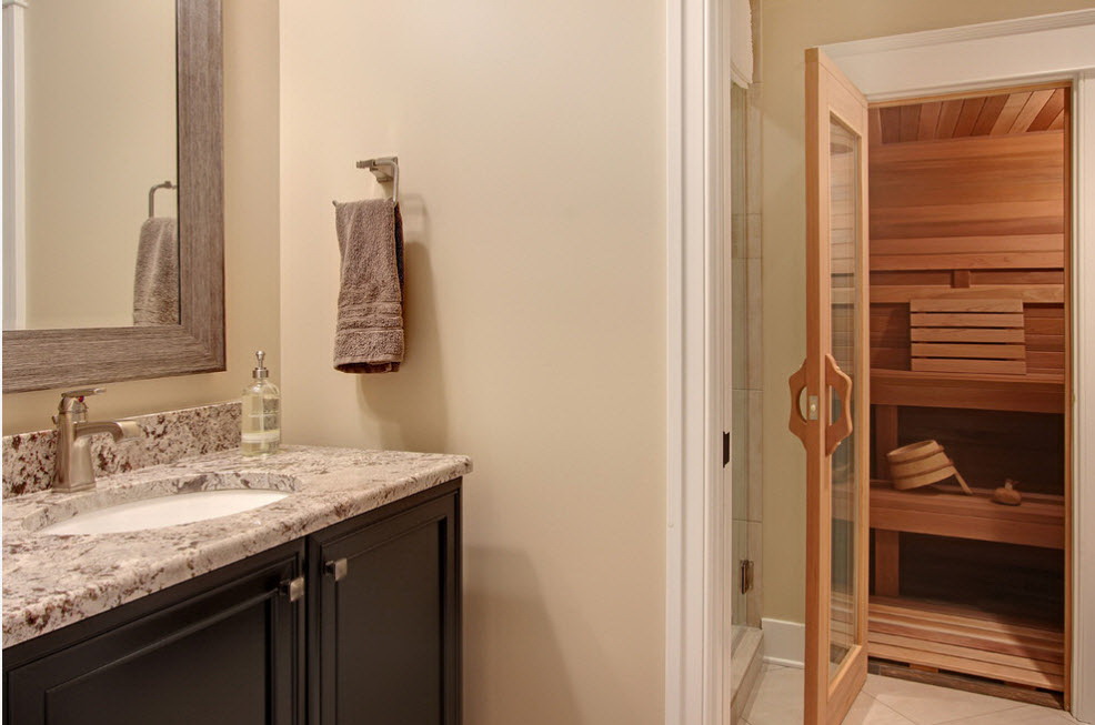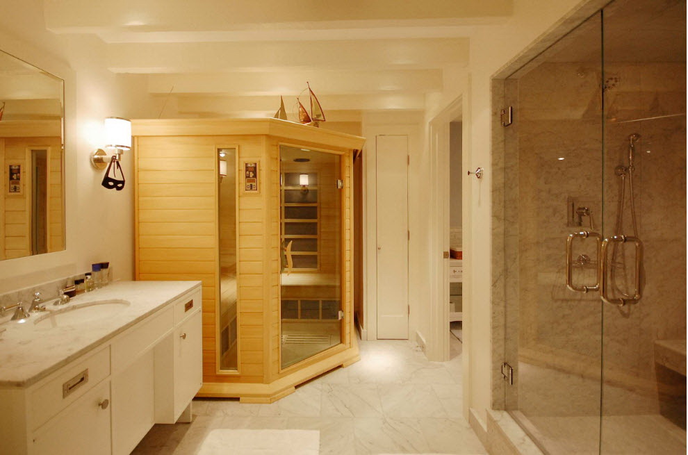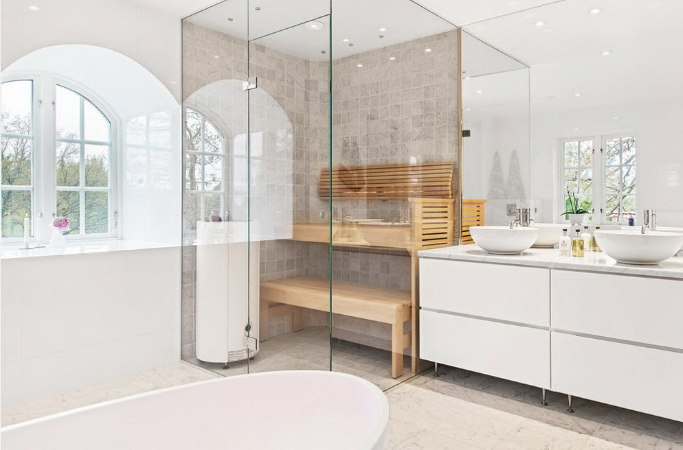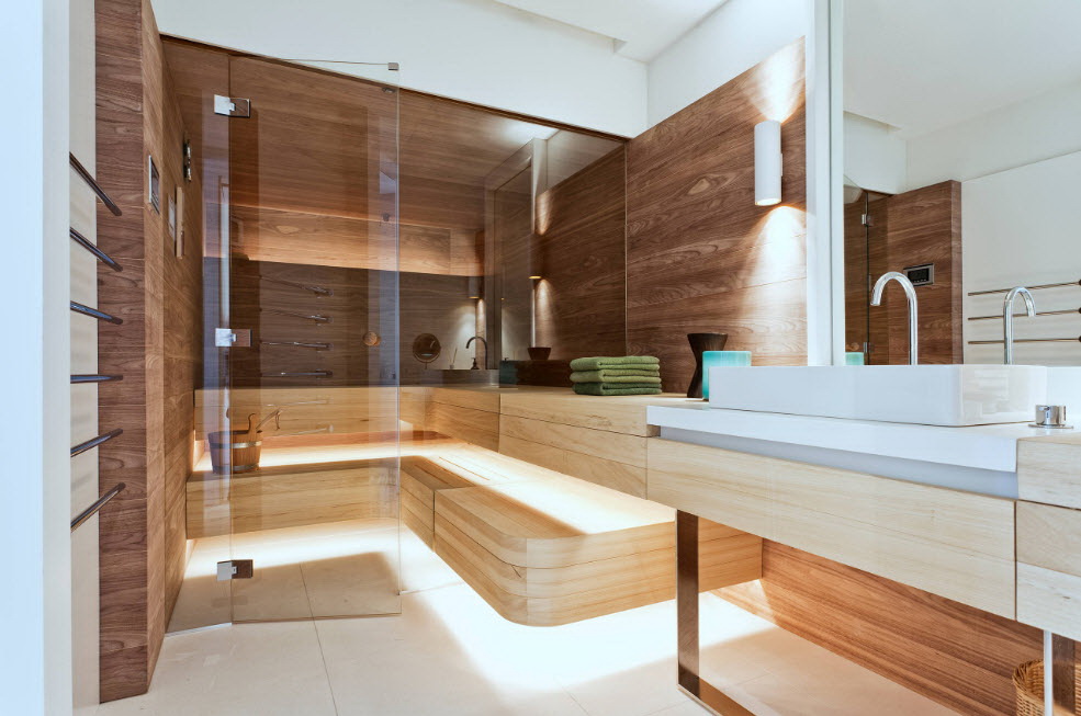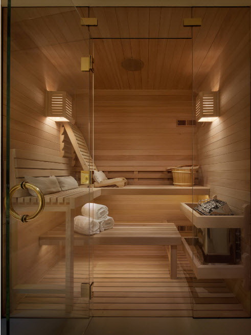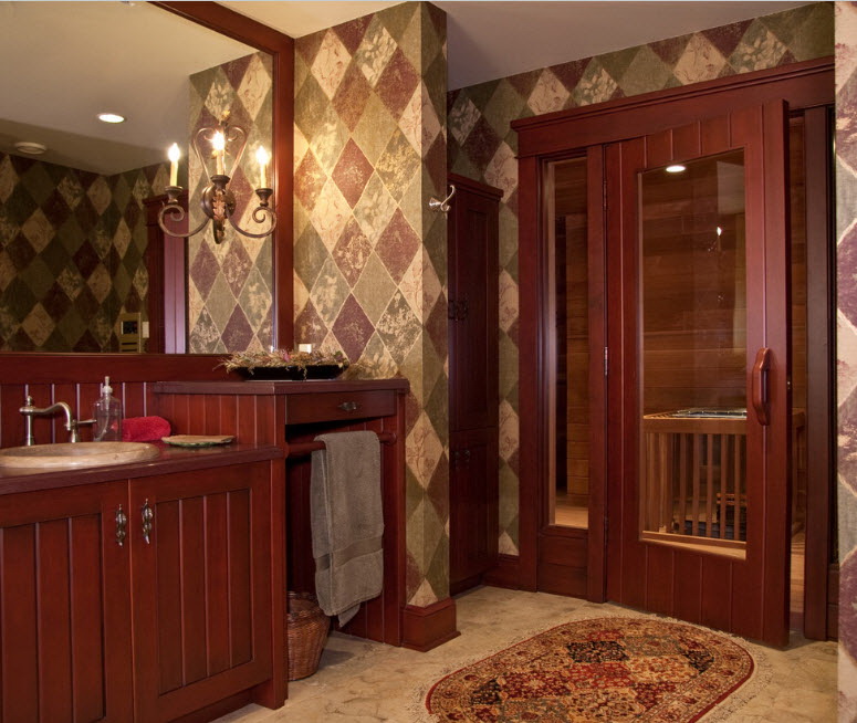 - Hammam turco - o calor é fornecido pela tubulação aquecida, que passa pelas paredes ao longo do perímetro da sala. A temperatura não excede 55 °, o que é confortável para pessoas que não toleram calor. O vapor é emitido através de canais especiais a uma altura de 1,5 m Mármore, pedra natural e azulejo dominam a decoração.
