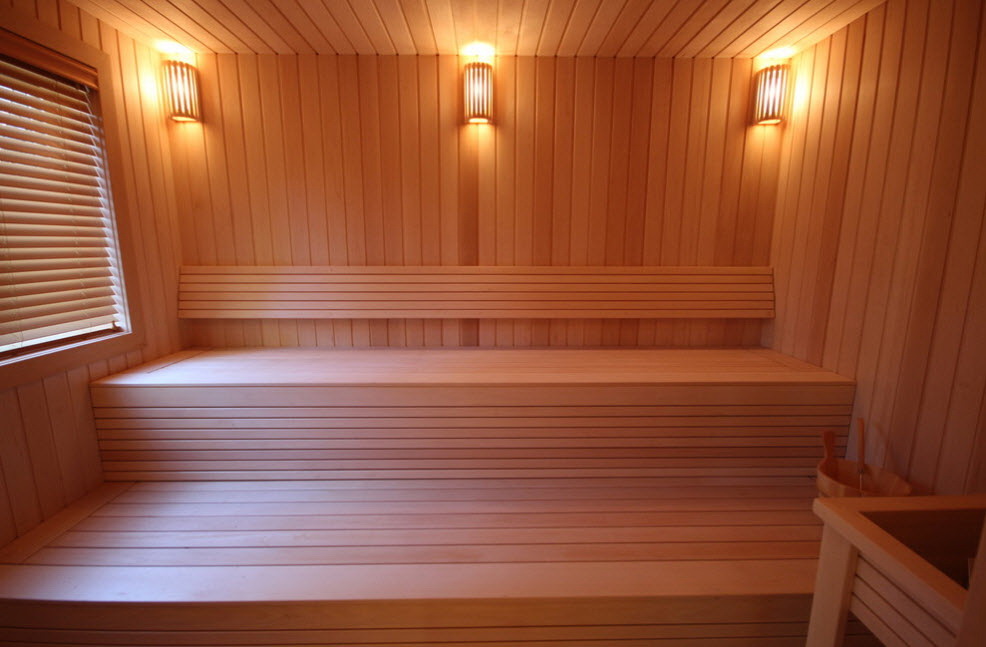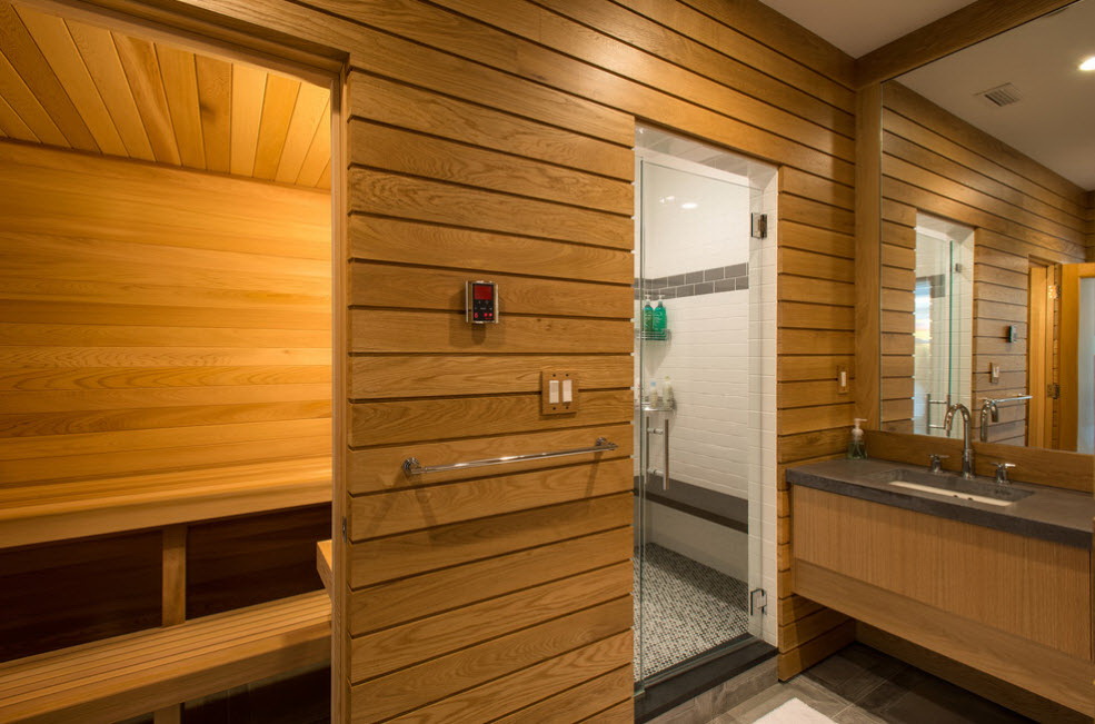 Sala de vapor - um lugar onde a temperatura e a umidade estão mudando constantemente. Para decoração, recomendamos revestimento de madeira não resinosa. Placas embainham as paredes, teto, colocando-as verticalmente, horizontalmente e em ângulo.Impregnação obrigatória de compostos de proteção.