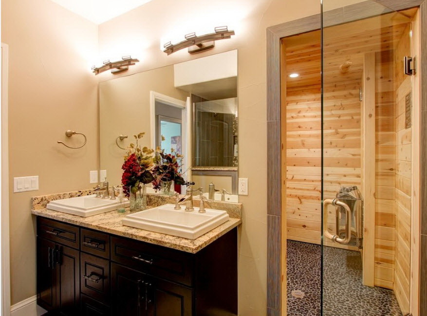 Em um banho pequeno, você pode combinar a sala de lavagem com a sala de vapor, sem separá-los com divisórias, mas se recusam a sair do banheiro.